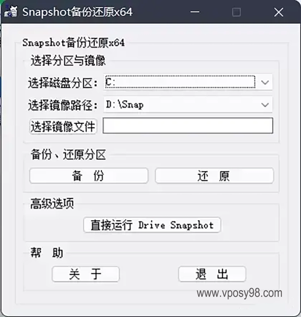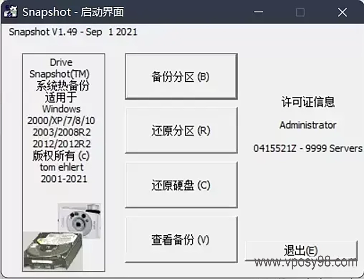 Drive SnapShot,小巧强大的系统热备份工具,德国硬盘备份还原软件。支持磁盘卷热备份还原、差异备份, 增量备份, 异机还原, 远程备份, RAID磁盘阵列, 挂载映像文件映射虚拟驱动器, 生成哈希文件, 命令行操作等,备份速度快,备份的镜像文件体积较小。该工具短小精悍,原生绿色单执行文件,无额外的临时数据生成。