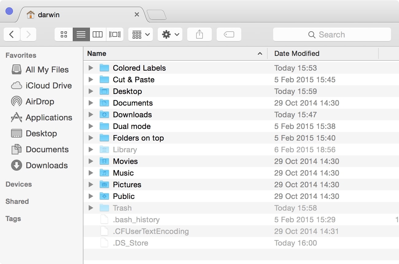 借助TotalFinder,您可以始终将文件夹显示在列表顶部,并对文件和目录进行排序,就像在原始Finder中一样。最重要的是,您只需按键即可显示所有隐藏的系统或用户文件。所有隐藏的文件也会在常规项目之前显示,以提供更流畅,更轻松的浏览体验。