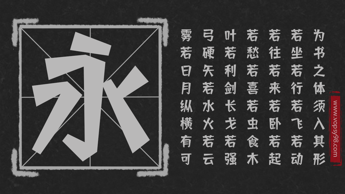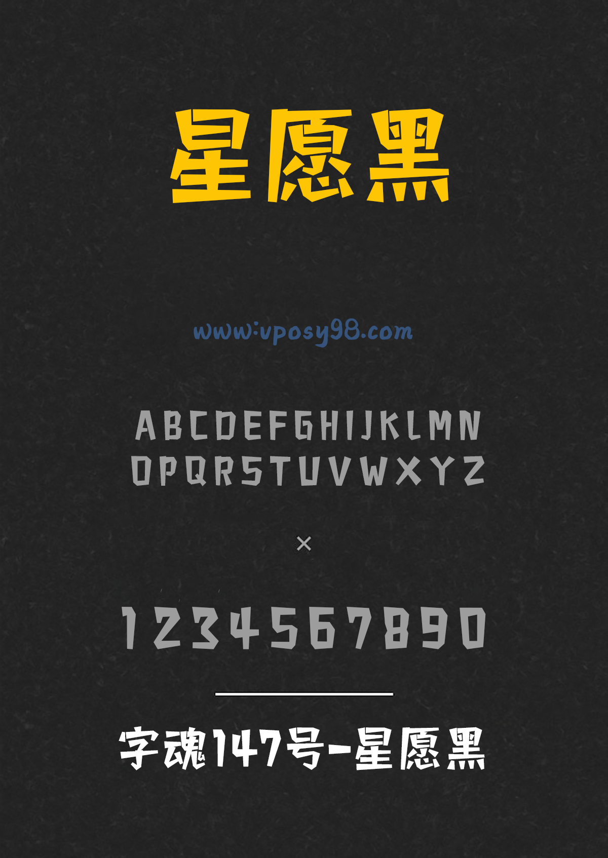 字魂147号-星愿黑字体是一款有趣的创意字,字体造型是以图形化手法设计的,常规字体笔画中带有弧线的部分全使用直线来代替,字的轮廓以不规则的四边形构成,竖笔画呈梯形,字形结构非常饱满、坚实有力。字体的折角部分,采用斜直线的处理方法,凸显了字体的四边形结构显得稳健有力。笔画设计使用开口设计,并且开口位置是左上角和右下角。如“日”字上下端和中间的横不闭合,使整个字体的留白空间变得更大,有趣而又特别。几何化程度非常的高,没有任何的曲线,横被设计成四边形,并且两端是左粗右细,显得个性非凡。