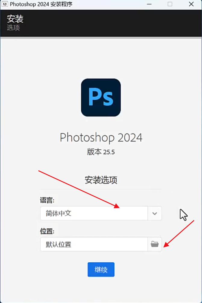 3、自定义安装位置,选择语言,点击继续(如下图)