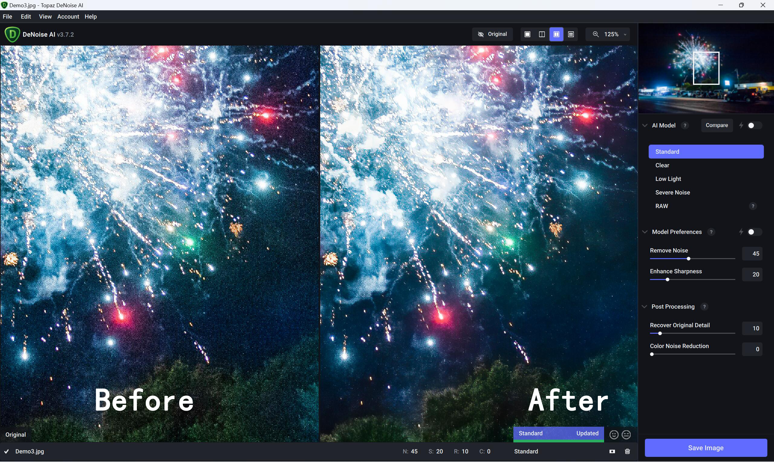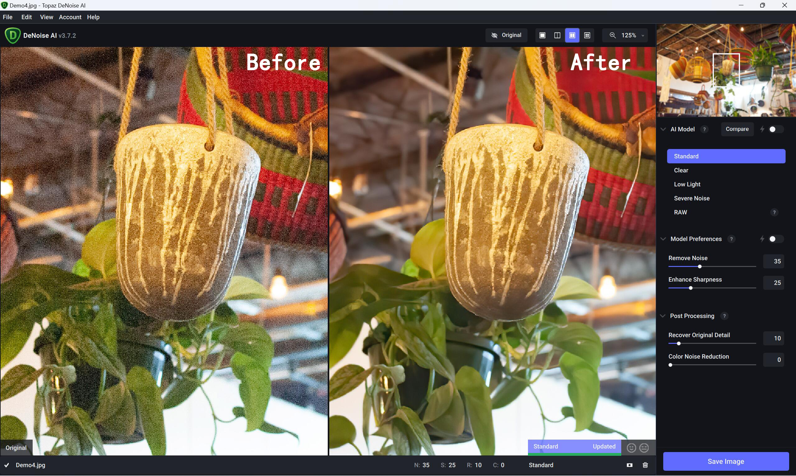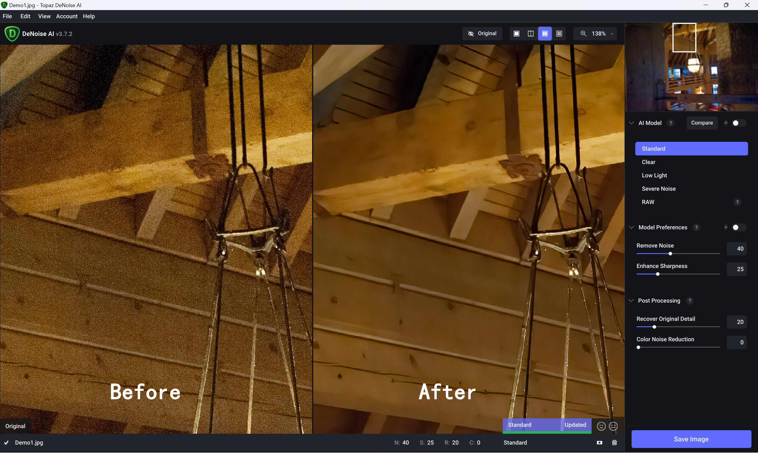 任何降噪工具都可以消除噪音——棘手的部分是区分噪音和细节。降噪人工智能通过消除噪音,同时恢复原始图像细节,帮助您获得100%的最佳质量。试一试,自己看看有什么不同吧!