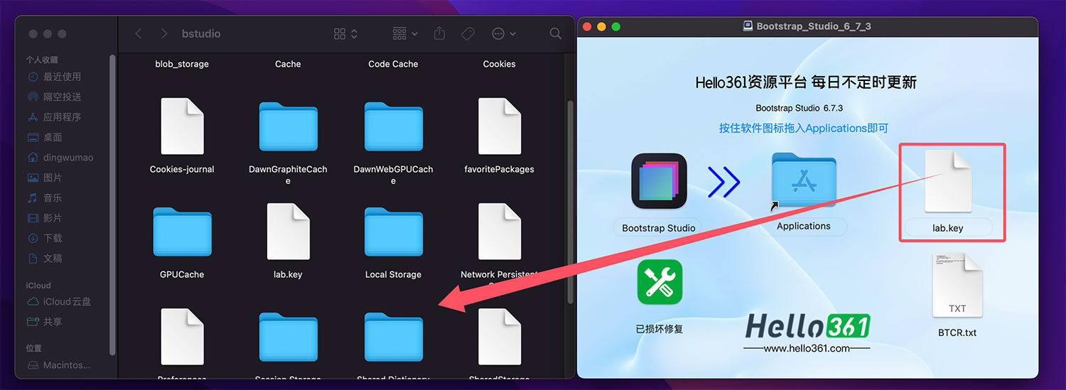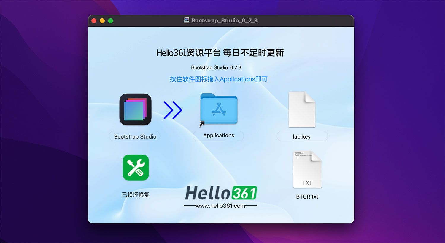 bootstrap studio破解版下载完成后打开,拖动左侧的软件到右侧应用程序中