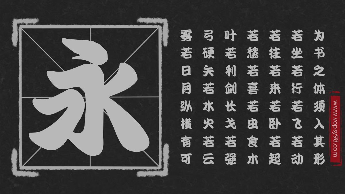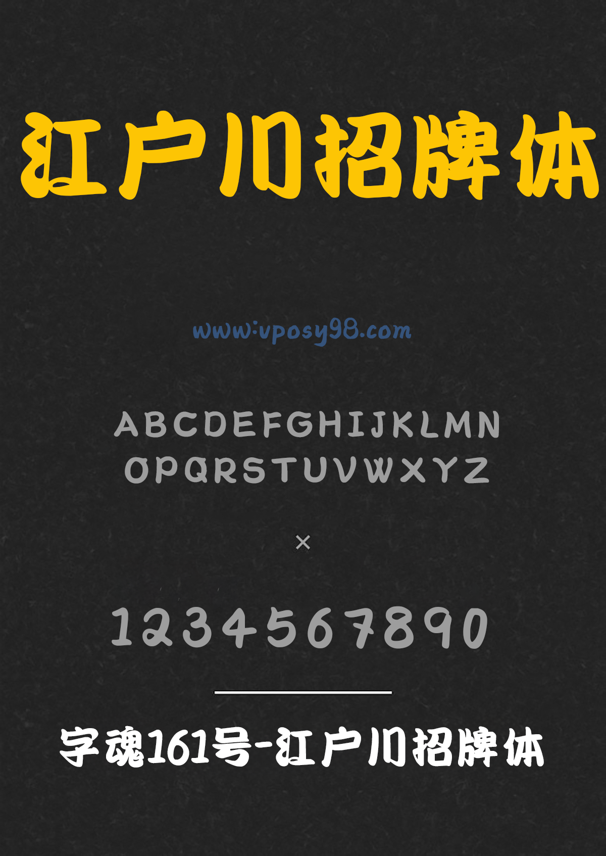 字魂161号-江户川招牌体是一款书法勘亭流风格字。勘亭流是使用最广泛也是最常见的江户文字,在日本街头随处可见。它最早是用于落语(类似中国的单口相声)、歌舞伎等的招牌或节目表的字体。由戏剧界人物冈崎屋勘六设计,勘亭流就是得名自其别号“勘亭”,江户川招牌体完美继承了勘亭流的特点。字体的笔画基本上舍弃了直线与折角,大量的采用曲线和弯角构成的组合方式,字形看上去非常圆润、敦厚。
