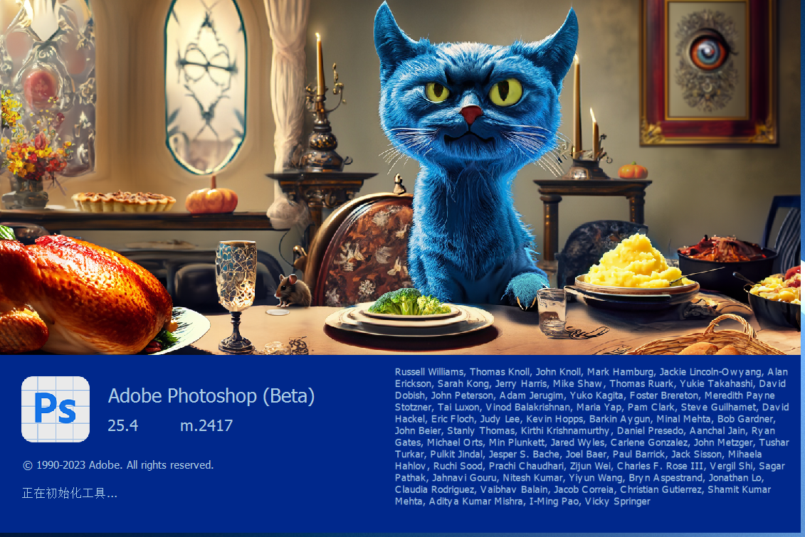最新PS 2024 Beta 迎来了更新,细心的小伙伴应该发现,win版的PS 2024 25.3 Beta启动界面变了,变成了一只蓝猫。