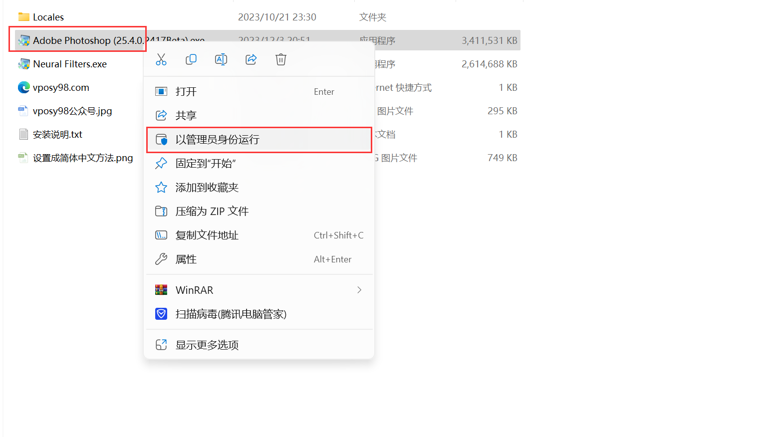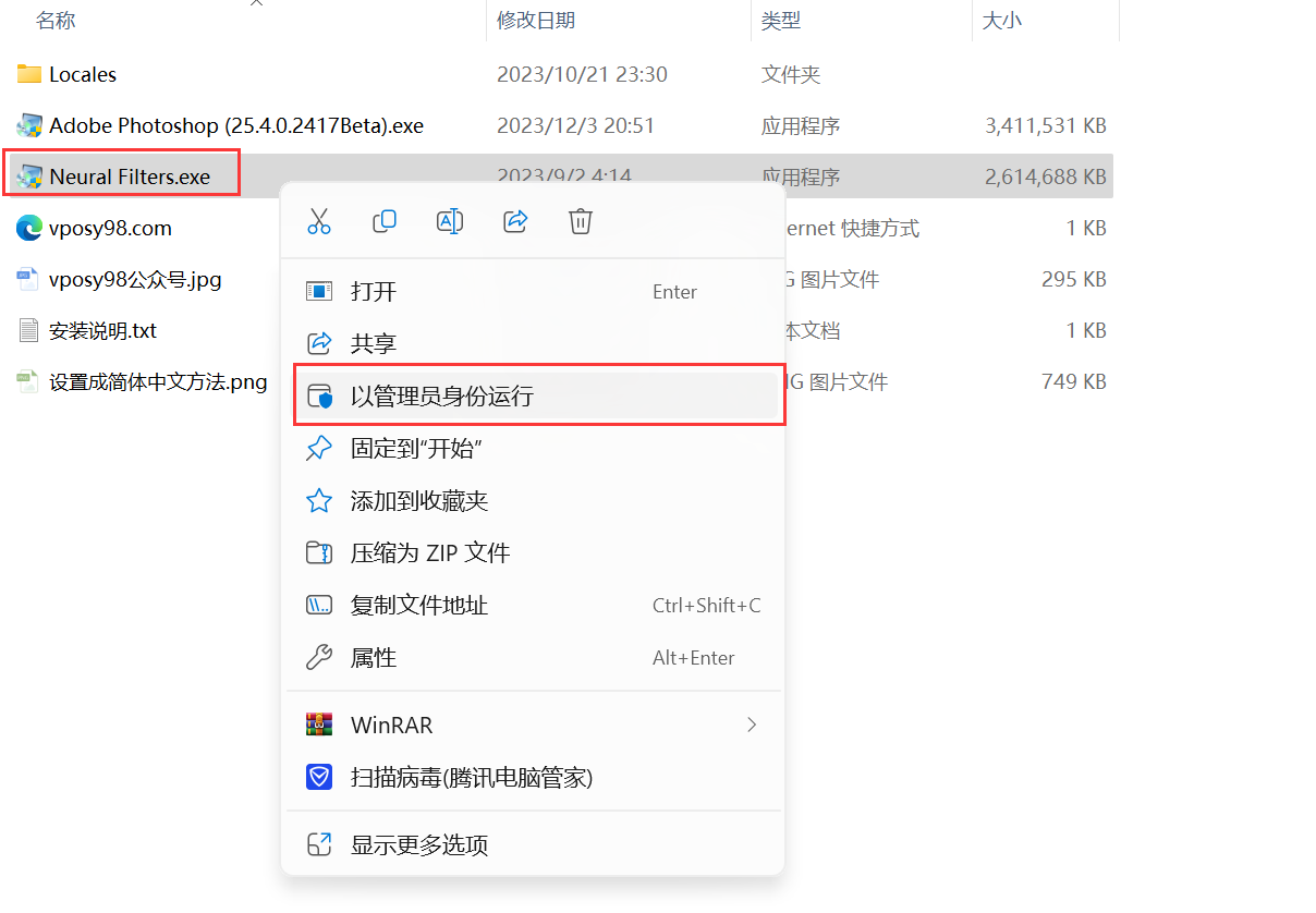 2、右键”Adobe Photoshop (25.4.0.2417Beta).exe”管理员运行(如下图)