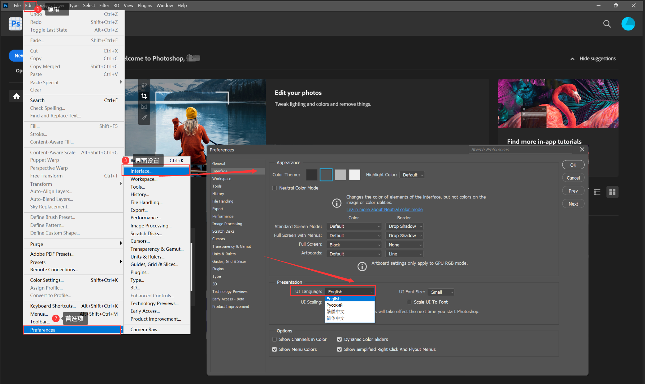 5、打开软件,依次点击 Edit→Preferences→interface→Pressentation→简体中文→OK