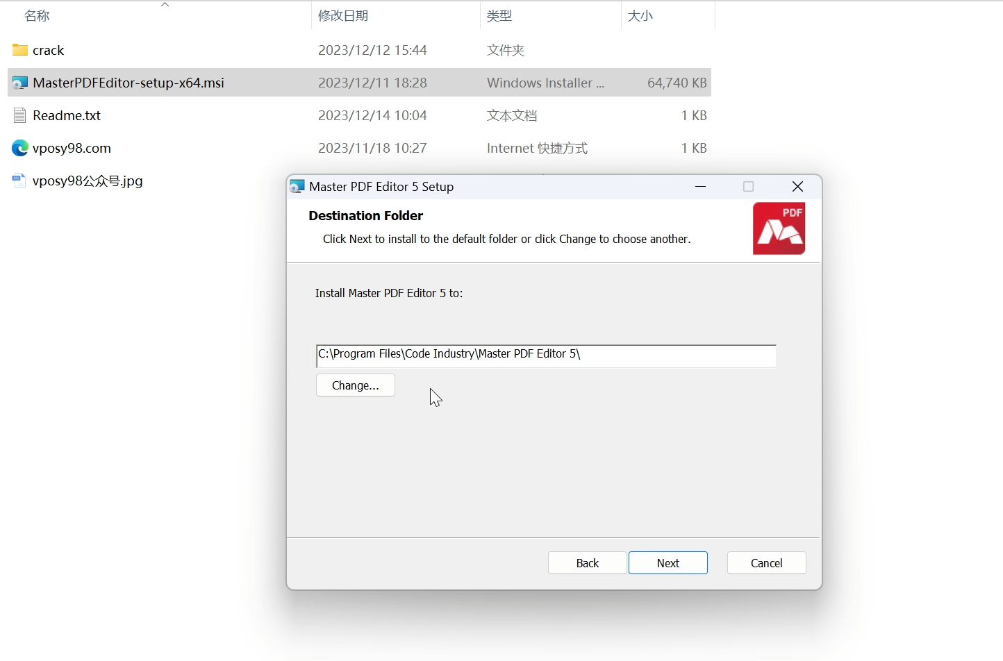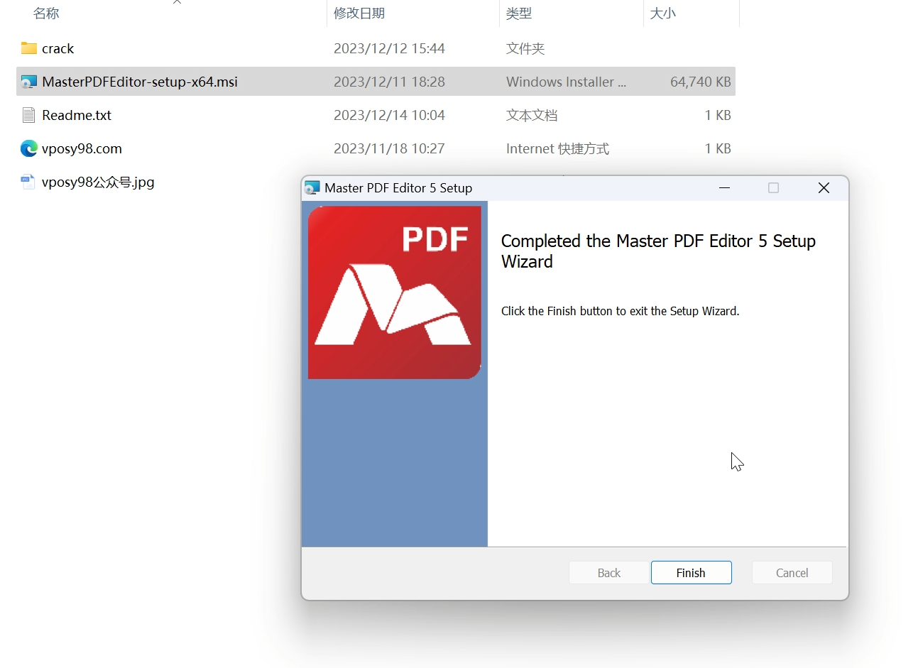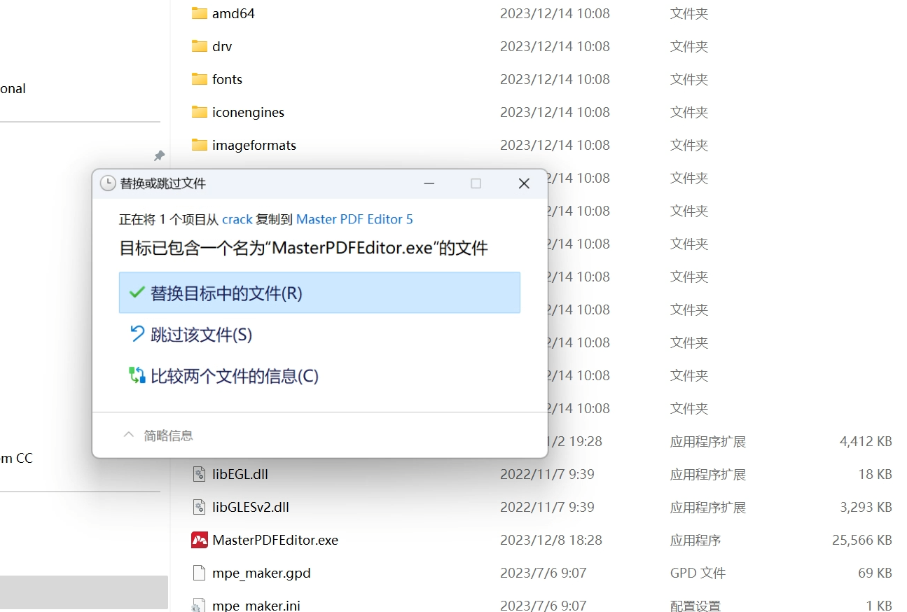 6、打开crack文件夹,把MasterPDFEditor.exe程序复制粘贴到软件安装文件夹里,替换掉原程序即可。
