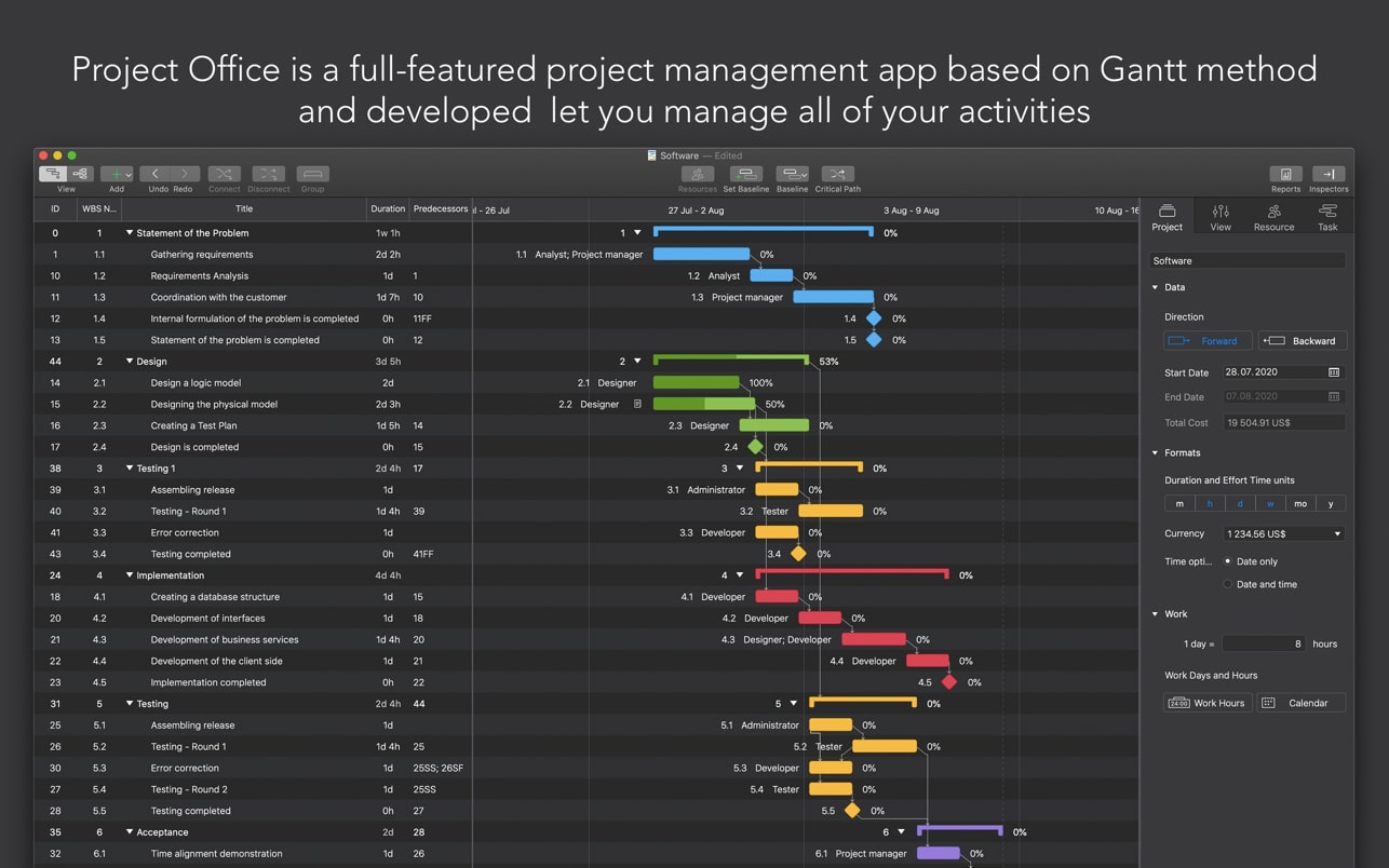 Project Office for Mac项目办公室高级版是一个全功能的项目管理应用程序。旨在帮助您管理、创建和监控项目。使用任务、里程碑、分组、连接和很多其他的功能来做出更好的工作安排。