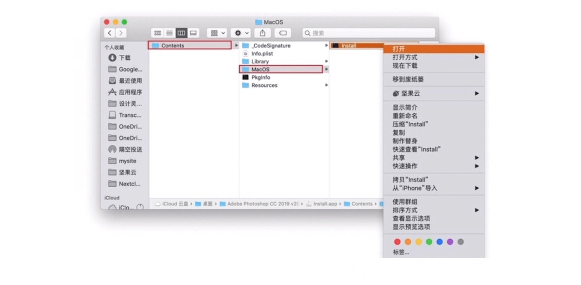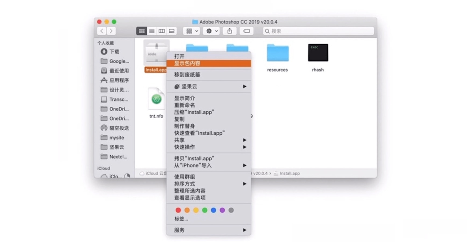 1、以安装Adobe Photoshop CC2019为例,打开安装包,找到  install.app  右键显示包内容。