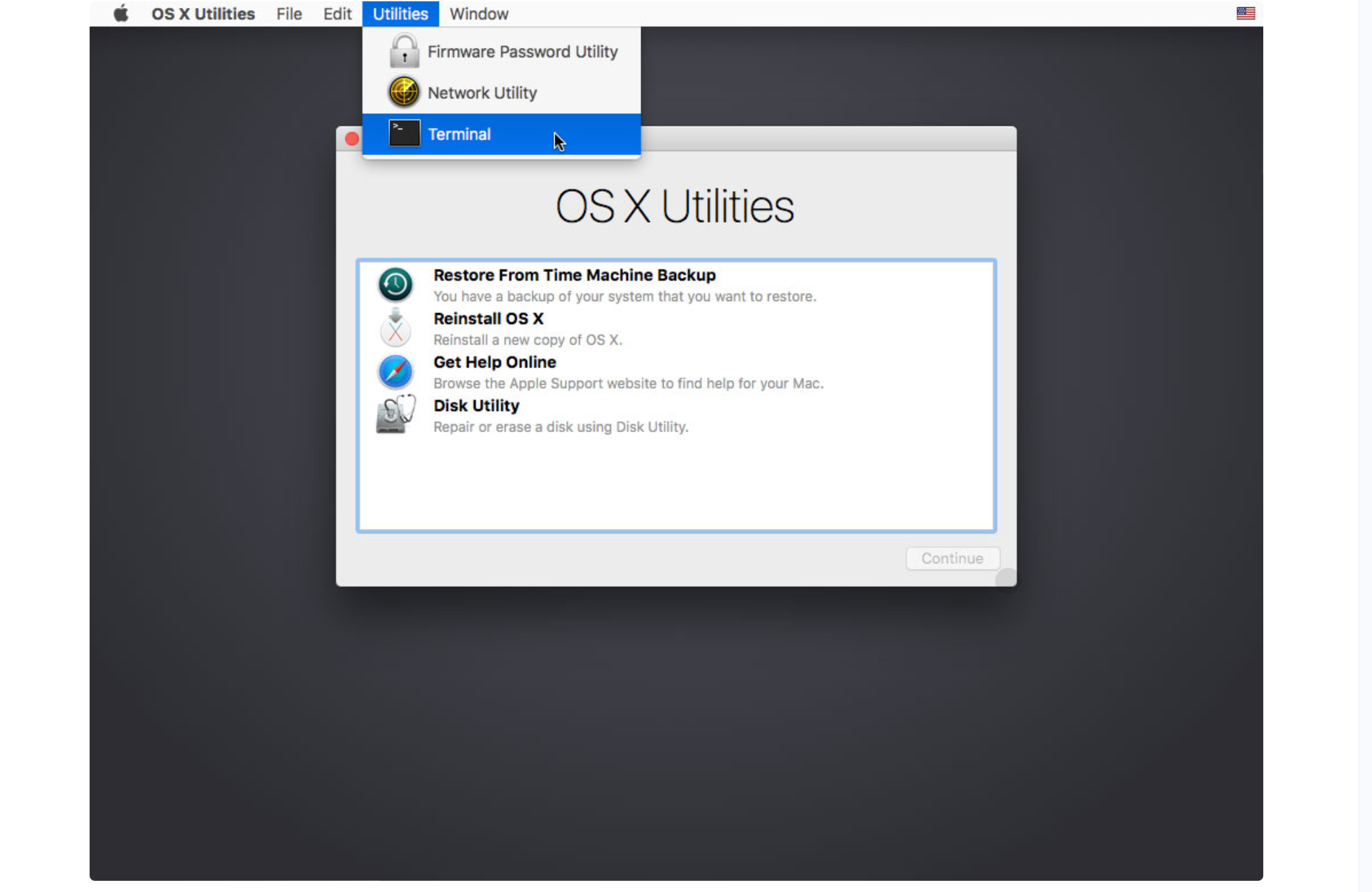 先关机,然后重新启动你的Mac电脑,如果是intel的cpu, 在开机时一直按住Command+R迸入Recovery模式。进入Recovery模式后,实用工具,打开终端,