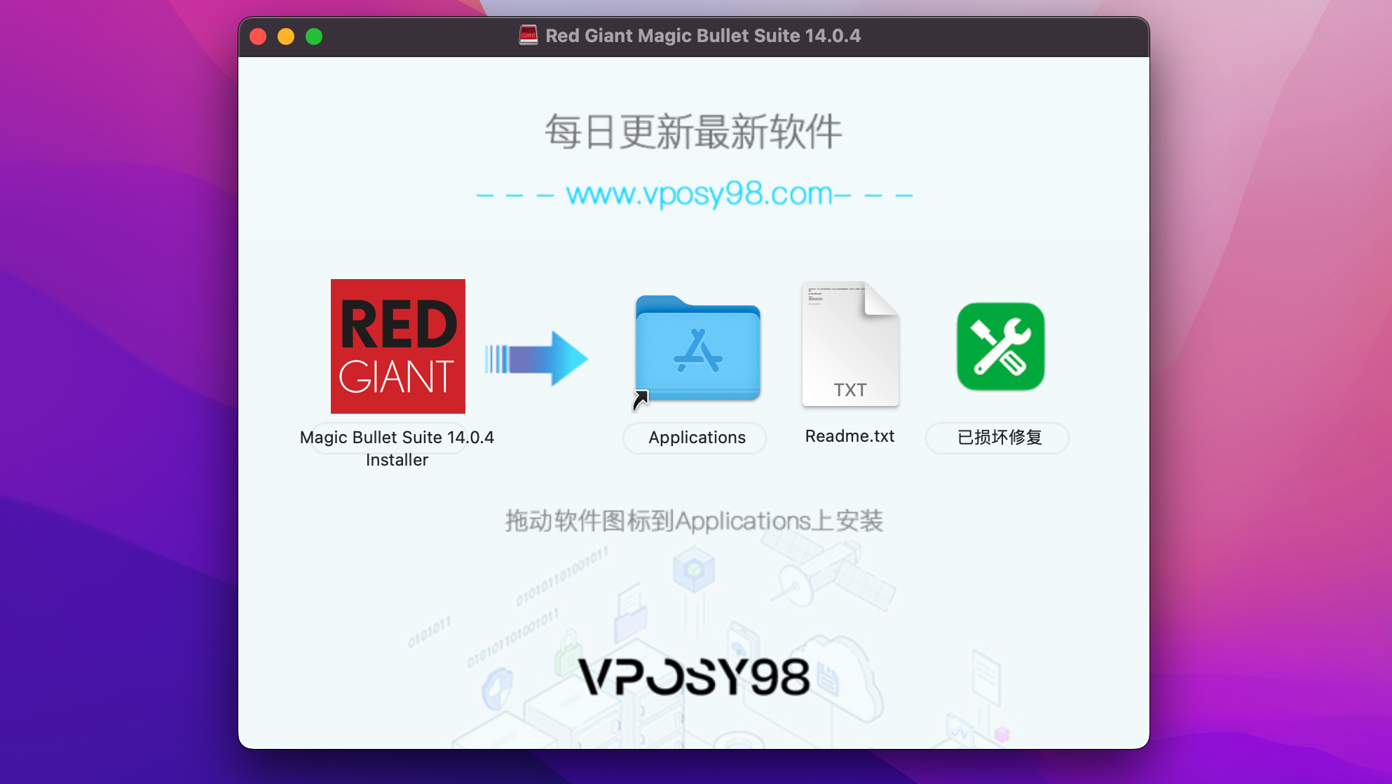1.下载完成后打开安装包,按住Magic Bullet Suite 14.0.4 Installer的图标拖动Applications上根据提示即可完成安装,如图: