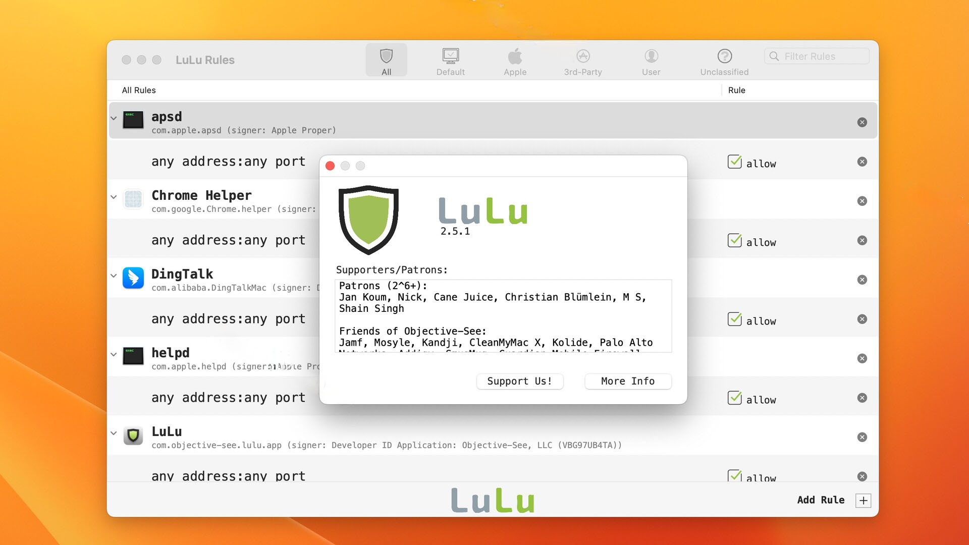 • 根据设计,LuLu仅监视传出网络连接。Apple的内置防火墙在阻止未经授权的传入连接方面做得很好。