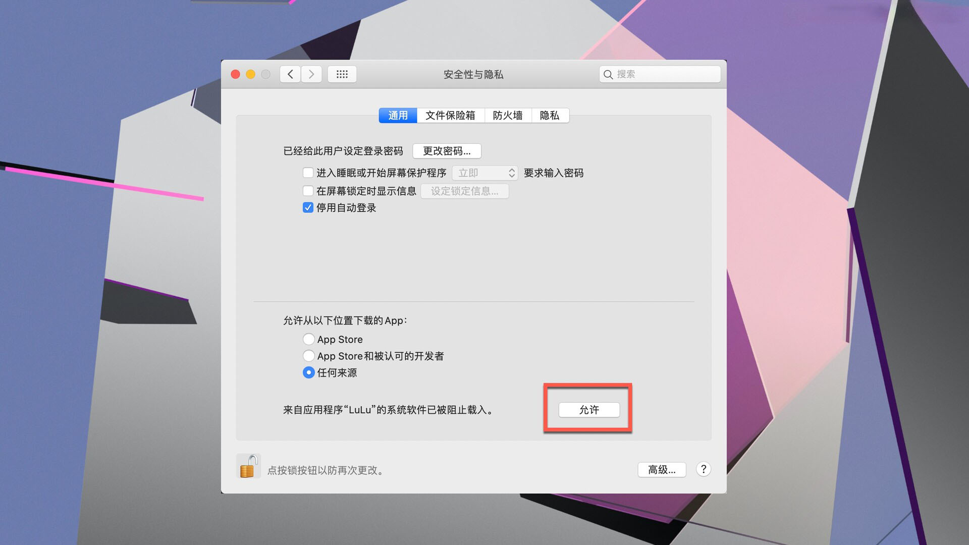 安装重启完成后,正常运行lulu需要打开系统隐私权限