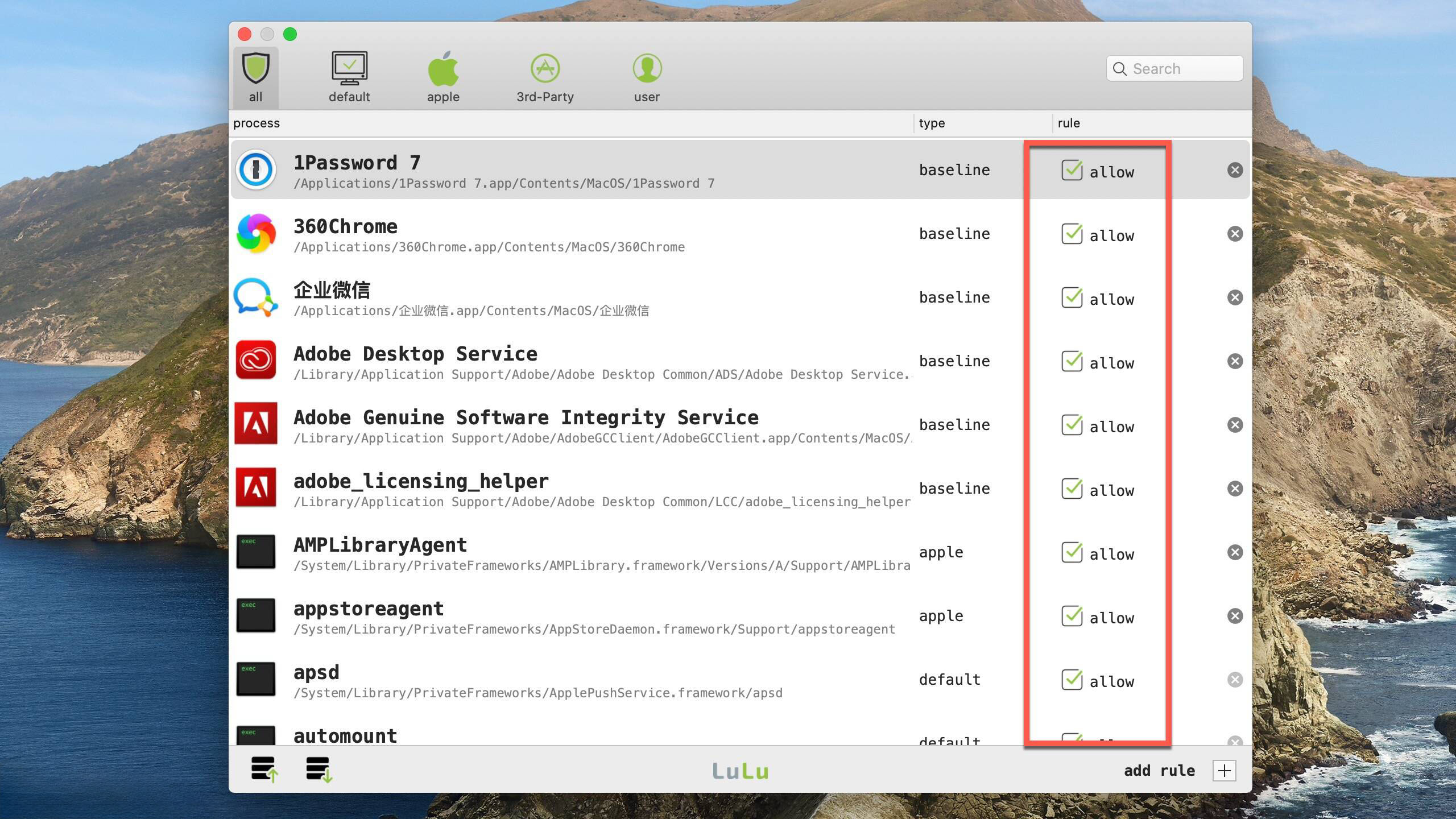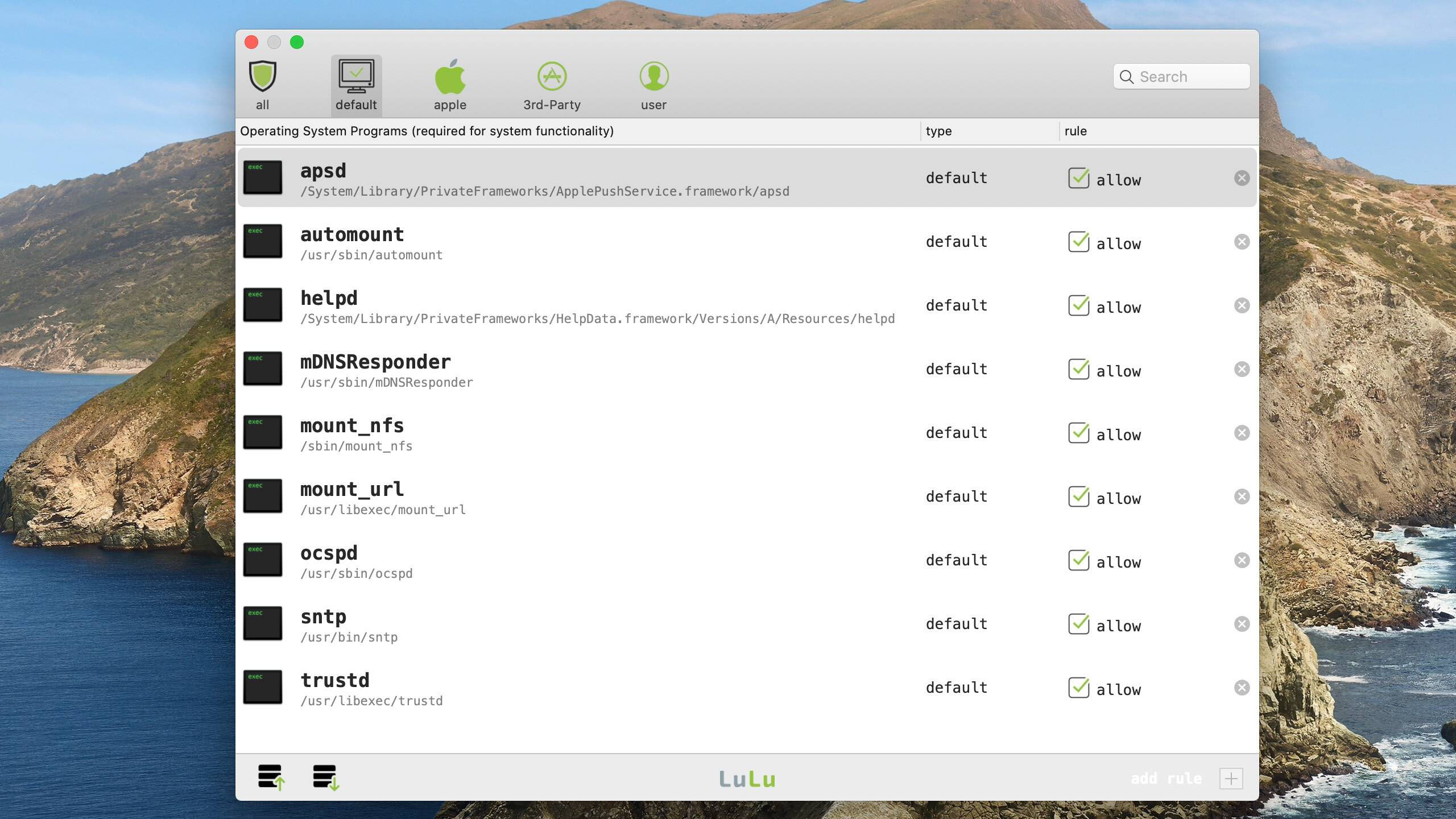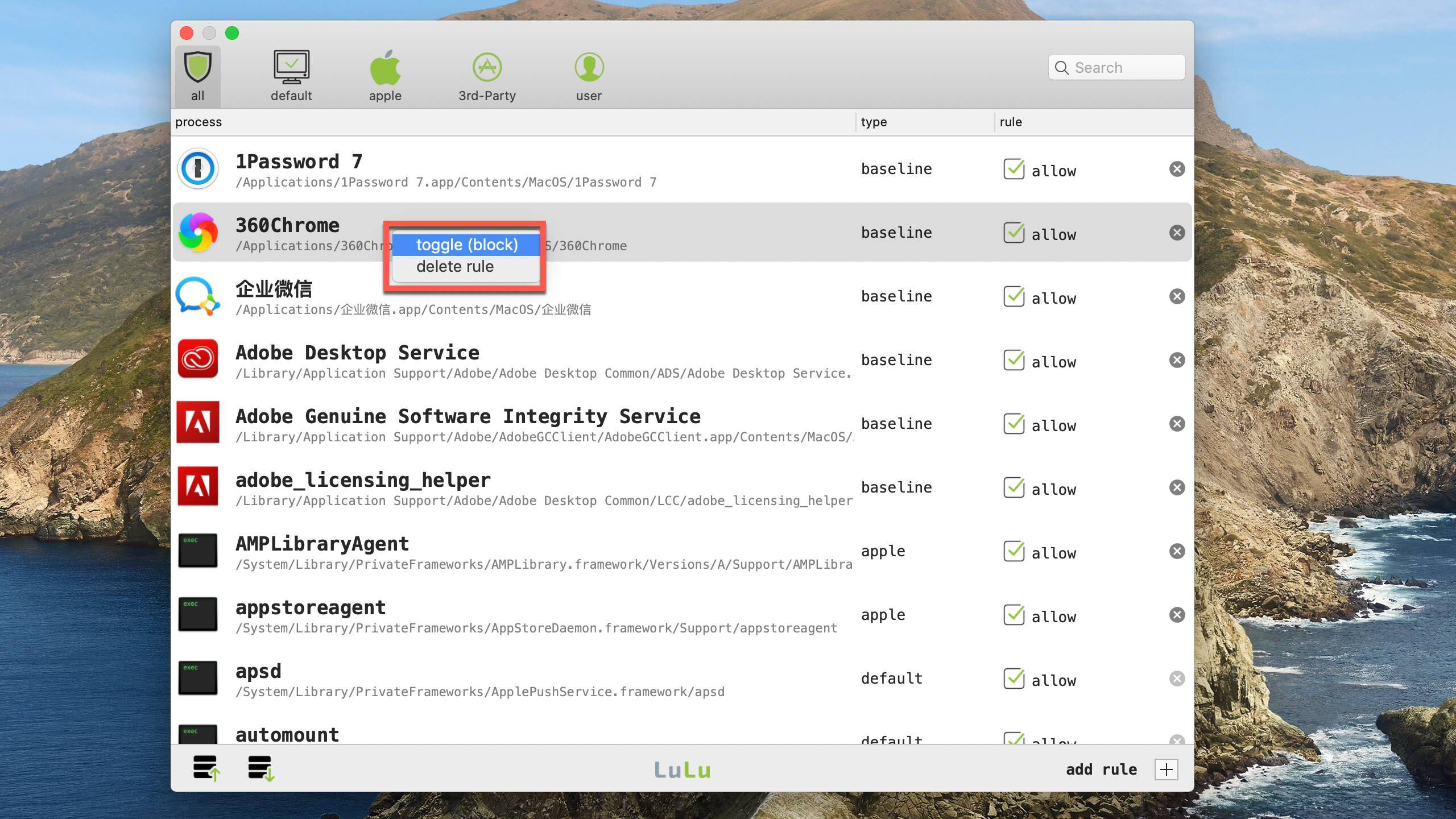 • 当前,LuLu仅在“进程级别”支持规则,这意味着允许某个进程(或应用程序)连接到网络或不连接到网络。与其他防火墙一样,这也意味着,如果恶意代码滥用了合法的(允许的)进程来执行网络操作,则将允许这样做。