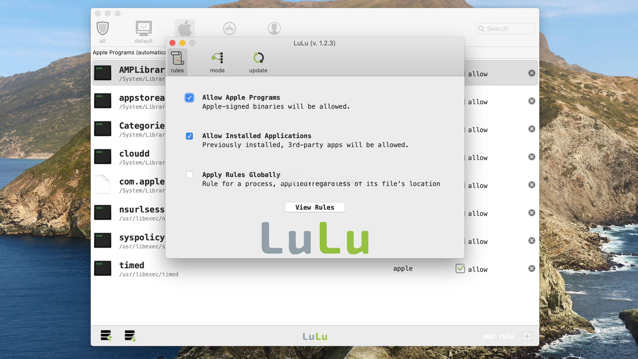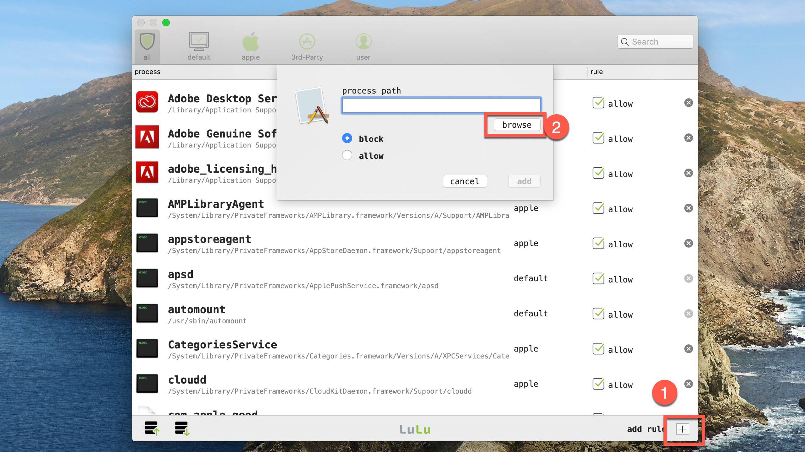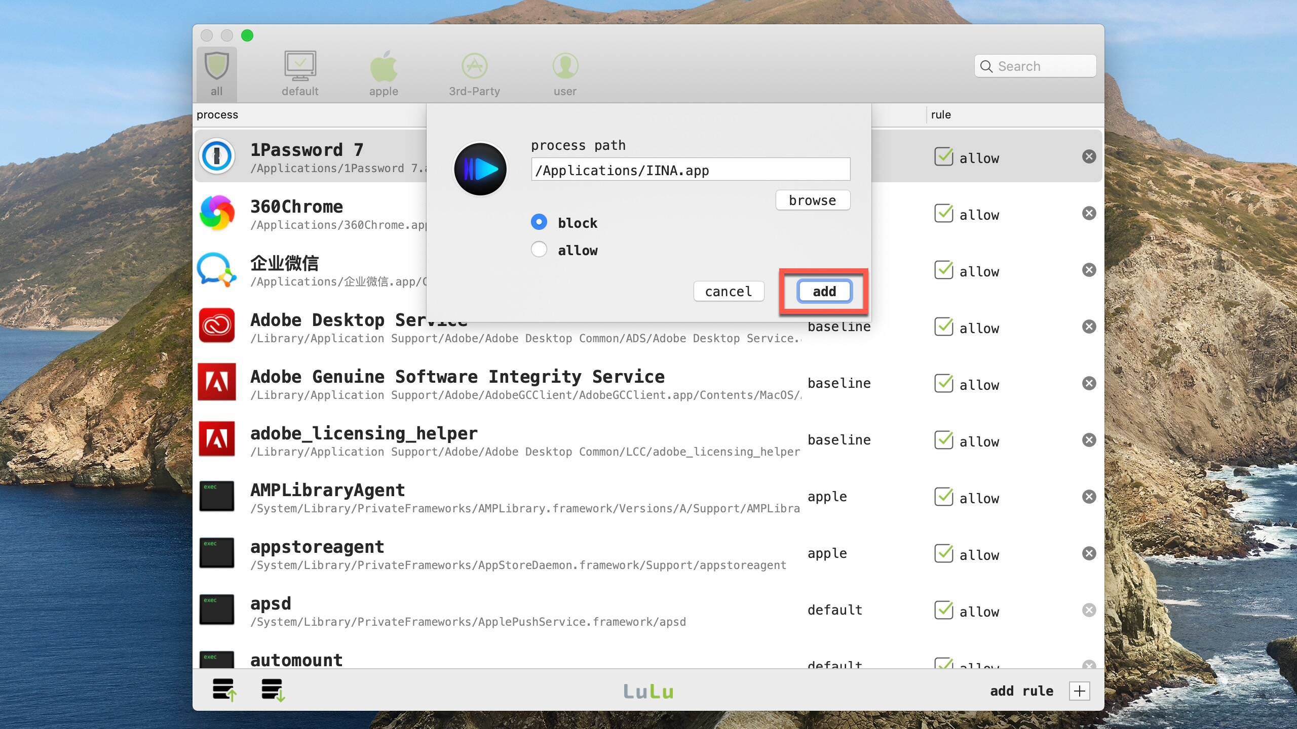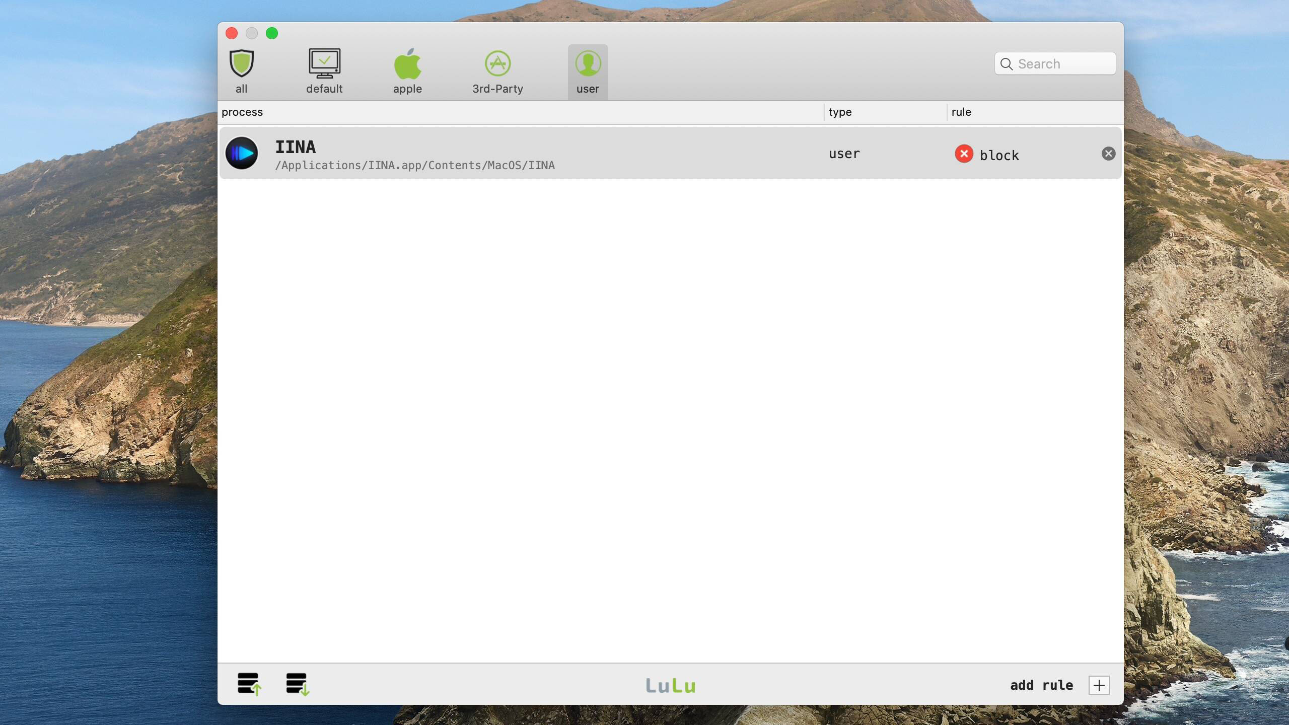 • 当前,LuLu仅在“进程级别”支持规则,这意味着允许某个进程(或应用程序)连接到网络或不连接到网络。与其他防火墙一样,这也意味着,如果恶意代码滥用了合法的(允许的)进程来执行网络操作,则将允许这样做。