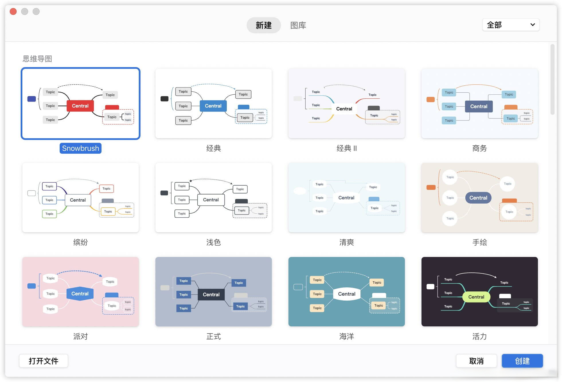 多种风格,百变随心。结构和配色方案的组合构筑出百变的主题风格。这次我们颠覆了以往内置主题风格的设定,在创建导图时即可自由选择结构和配色,让你用喜欢的方式画出思维导图的更多可能性。