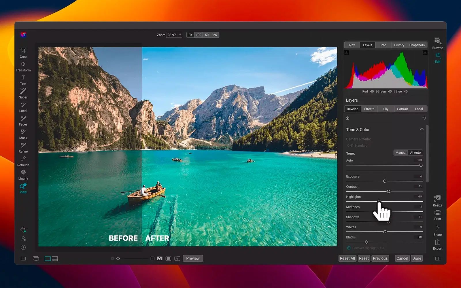 借助 AI 的力量,您的照片将看起来像您设想的场景。超越自动色调,让 AI 设置颜色和色调,而无需使用一刀切的算法。使用强大的 Brilliance AI 技术,轻松检测照片中的区域并自动应用局部调整,例如通过完全的用户控制使天空变暗或增强树叶。