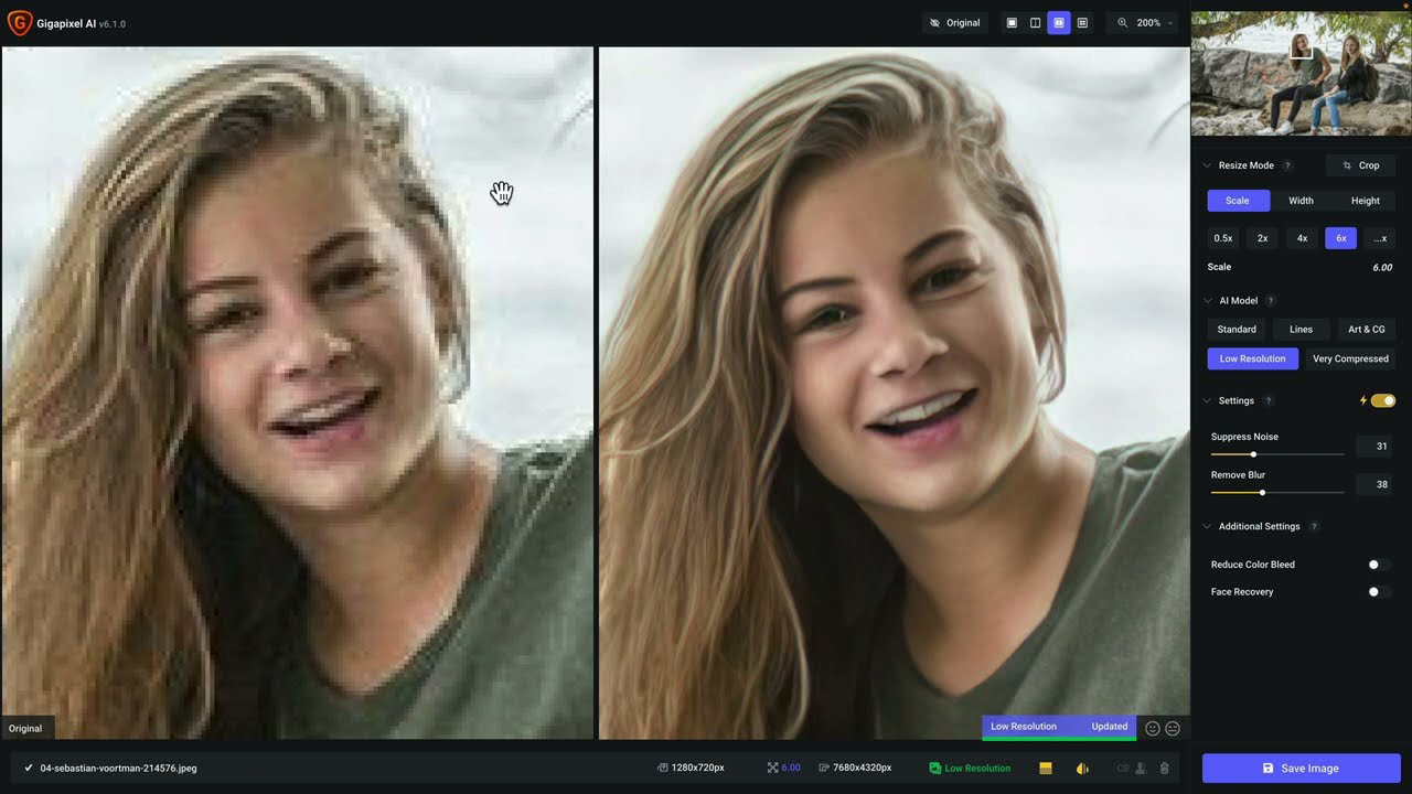 “Gigapixel AI可以执行高达600%的放大,并具有批处理模式,可以在处理整个图像文件夹时处理多个图像。现在,能够将1260×720像素的智能手机图像转换为具有增强的高光和阴影细节的24.14英寸喷墨打印成为可能。