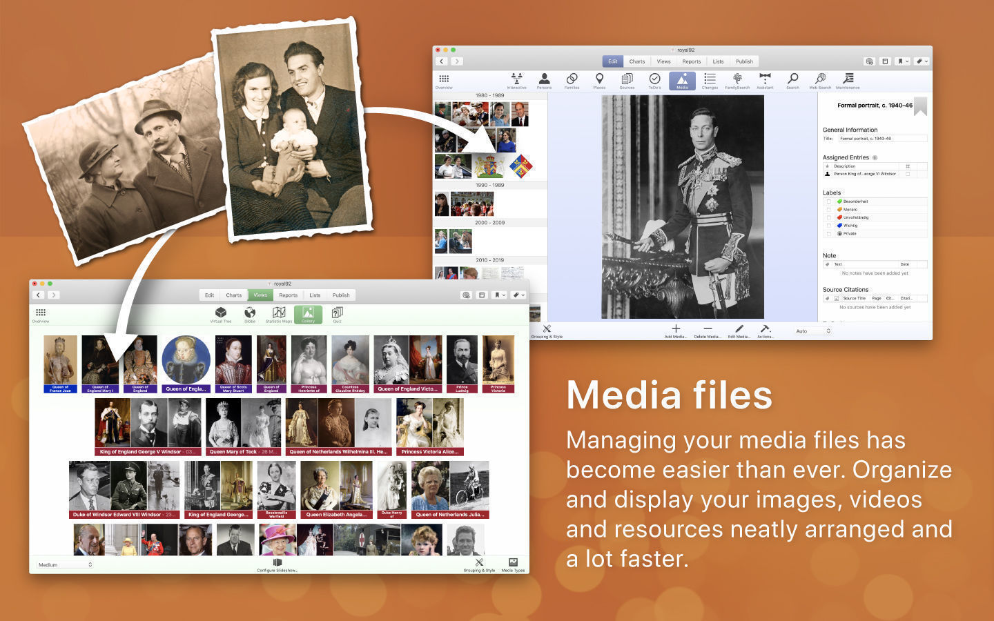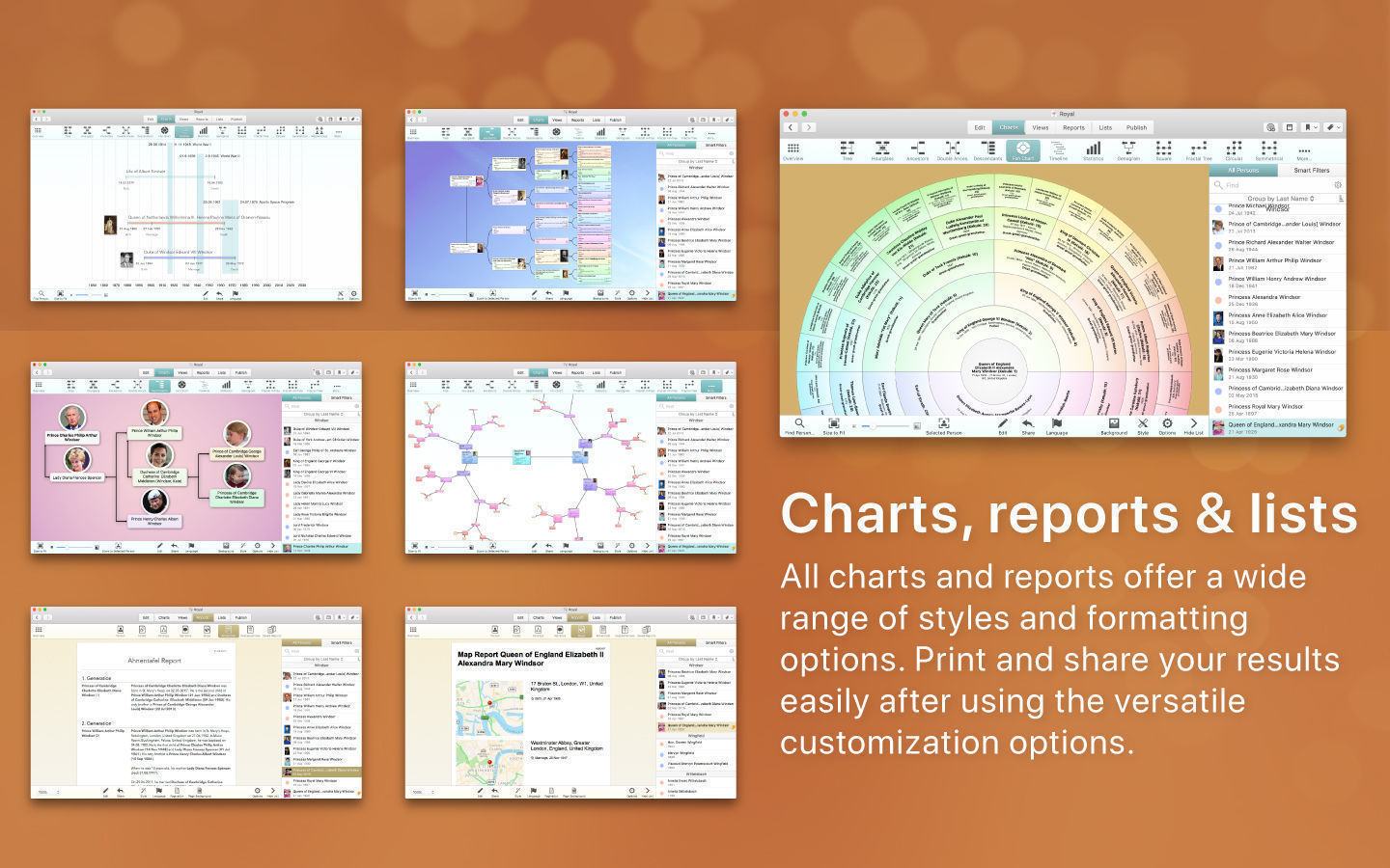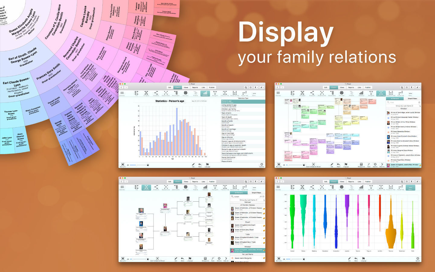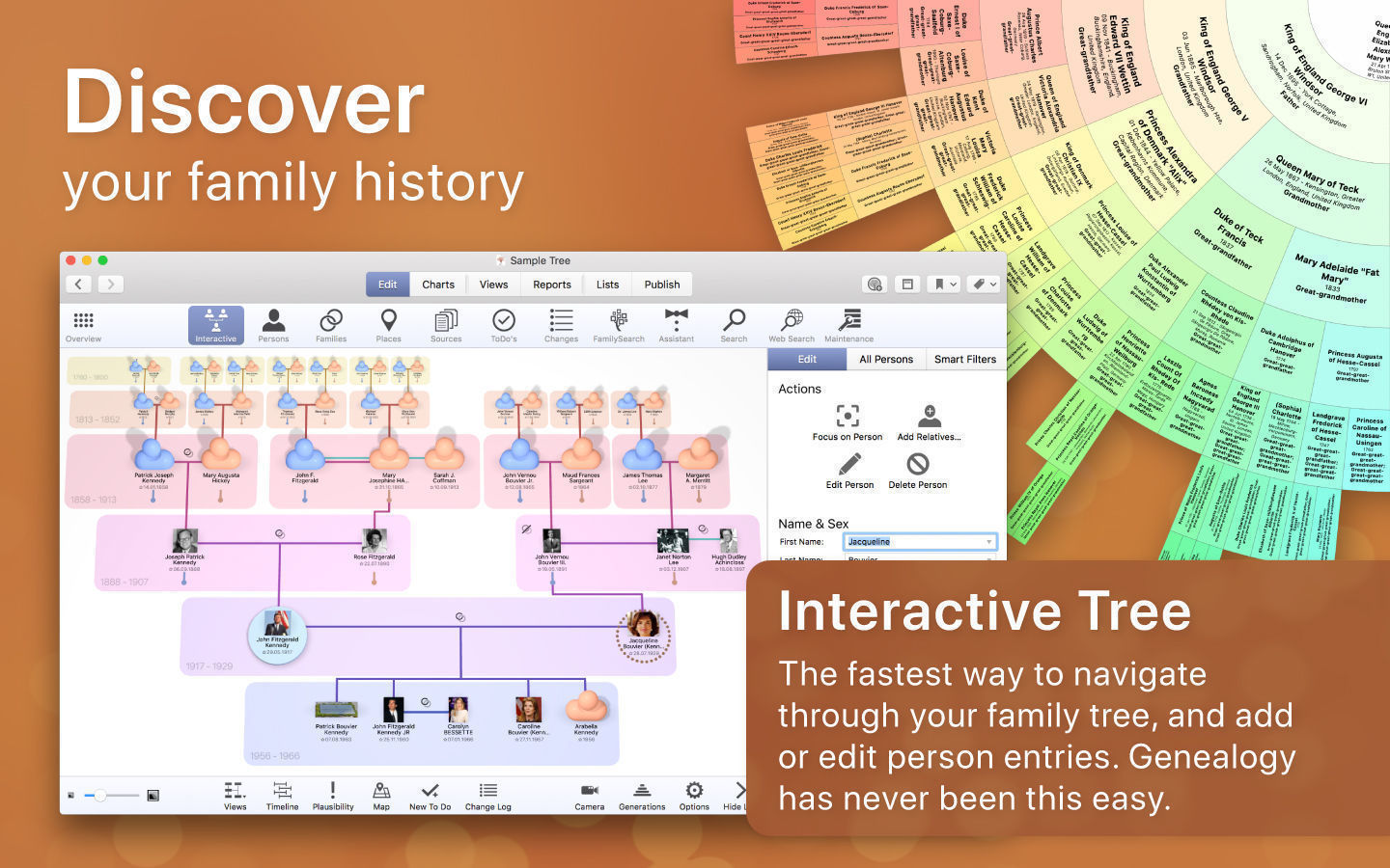 发现您的个人家族史!MacFamilyTree 9 对家谱进行了改造:现代、互动、方便和快速。探索你的家谱和你的家族历史,以一种会让你之前的几代编年史家感到惊讶的方式。创建视觉上令人印象深刻的图表、评估、报告和书籍,在交互式家谱或虚拟树 3D 视图中导航,并以全新的方式体验家谱。