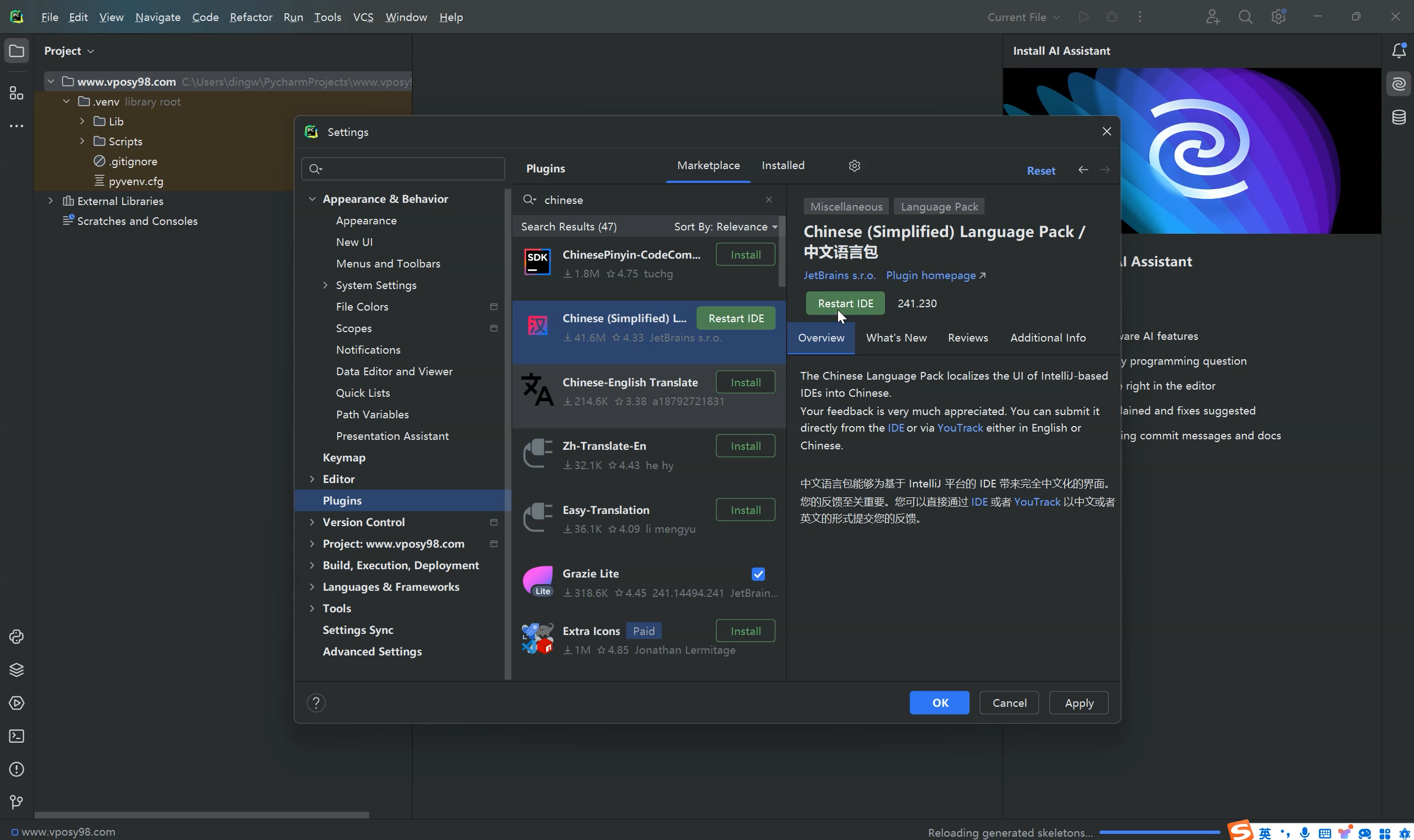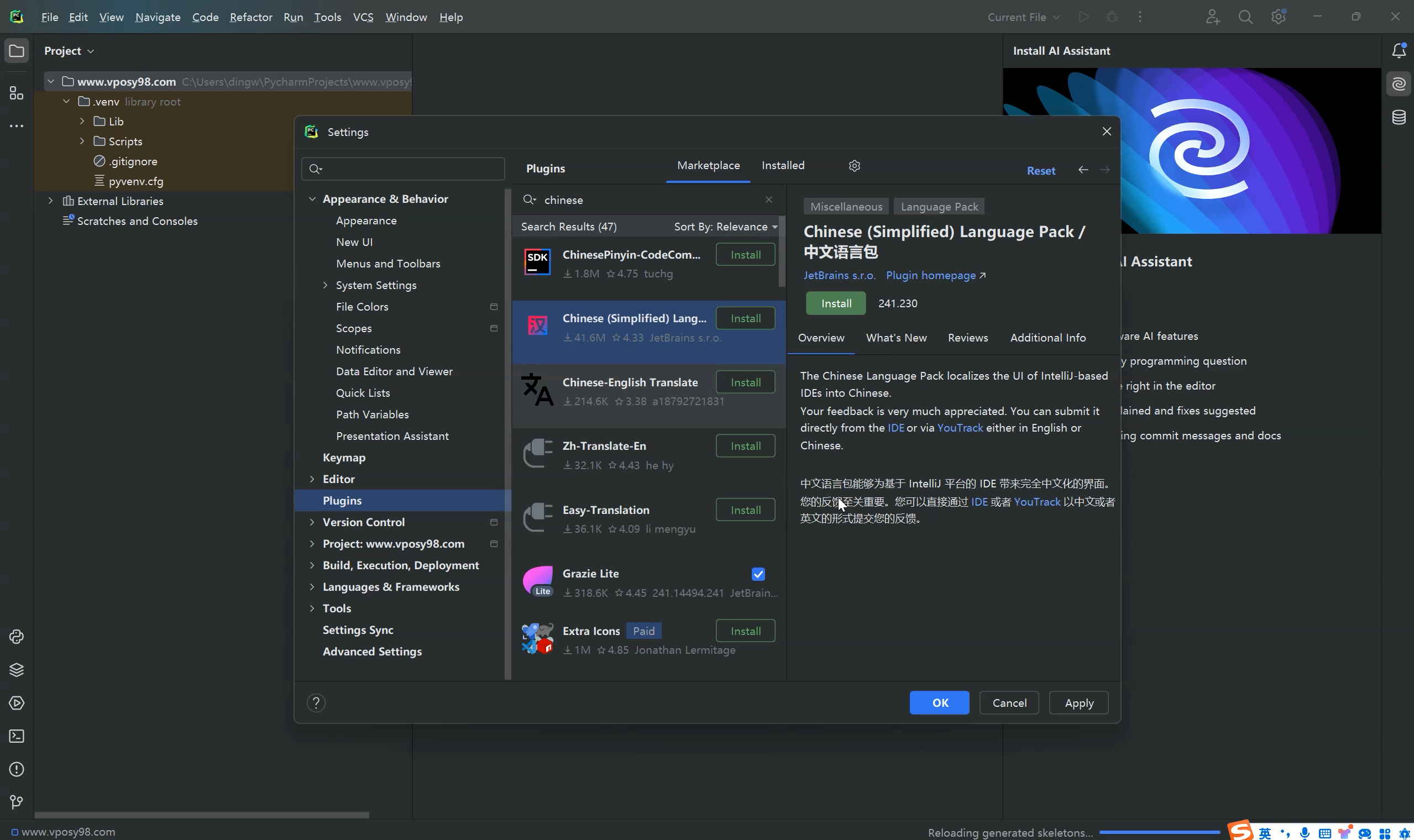 选择“marketplace”接着在输入框中输入“Chinese”后即可找到汉化插件,点击“install”进行下载
