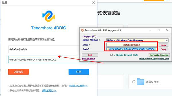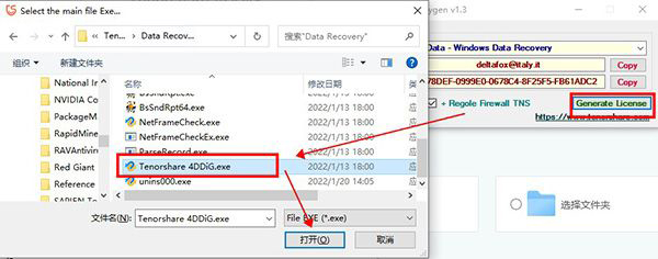 7、回到刚才下载的数据包中运行注册机程序“Tenorshare_12in1_Keygen_v1.3_By_DFoX.exe” Select Product 这里选择:UltData – Windows Data Recovery,点击Generate License,打开软件安装目录添加Tenorshare 4DDiG.exe打开