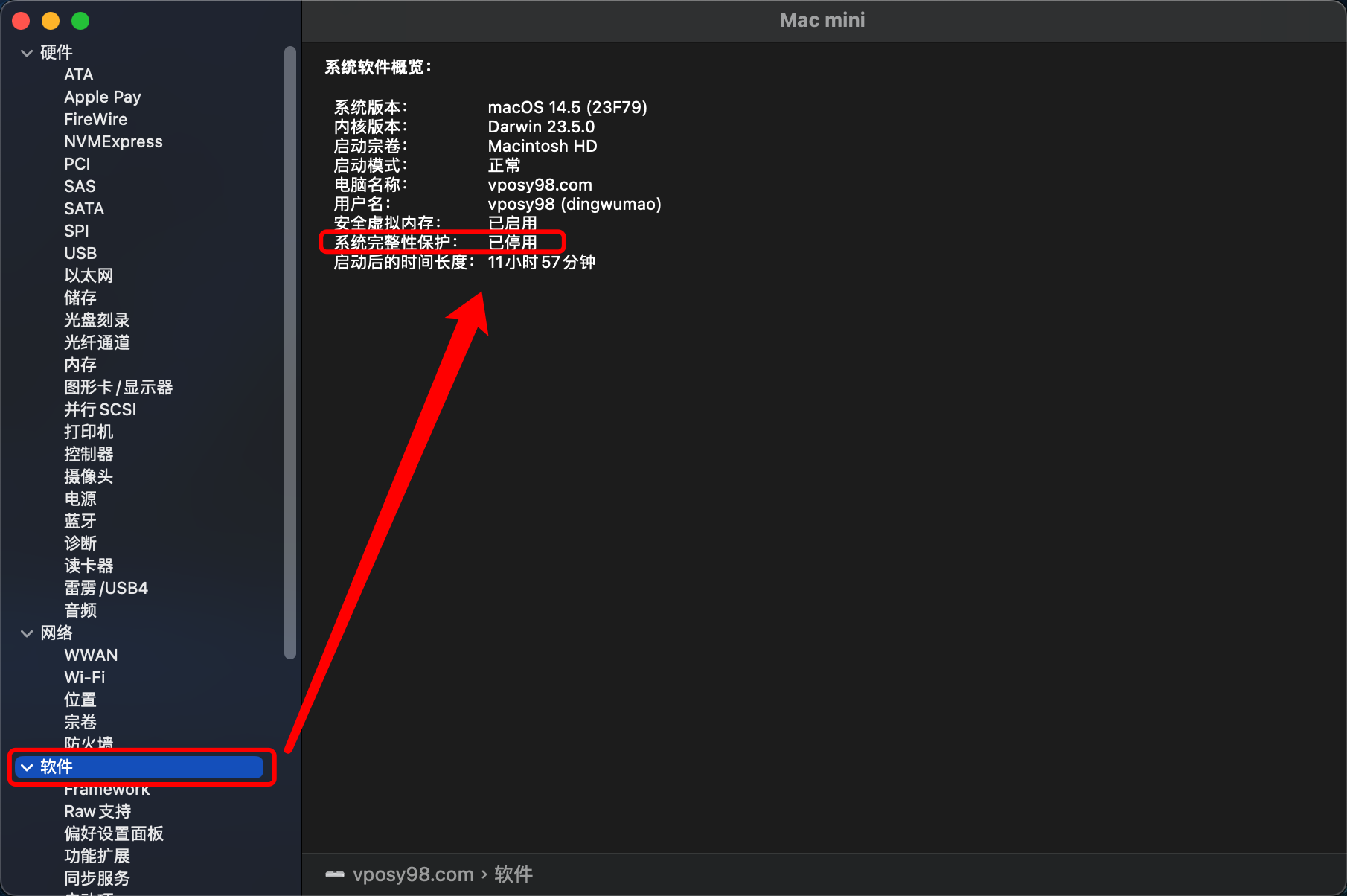 • 右侧查找「系统完整性保护」,看到「已启用」或「已禁用」消息