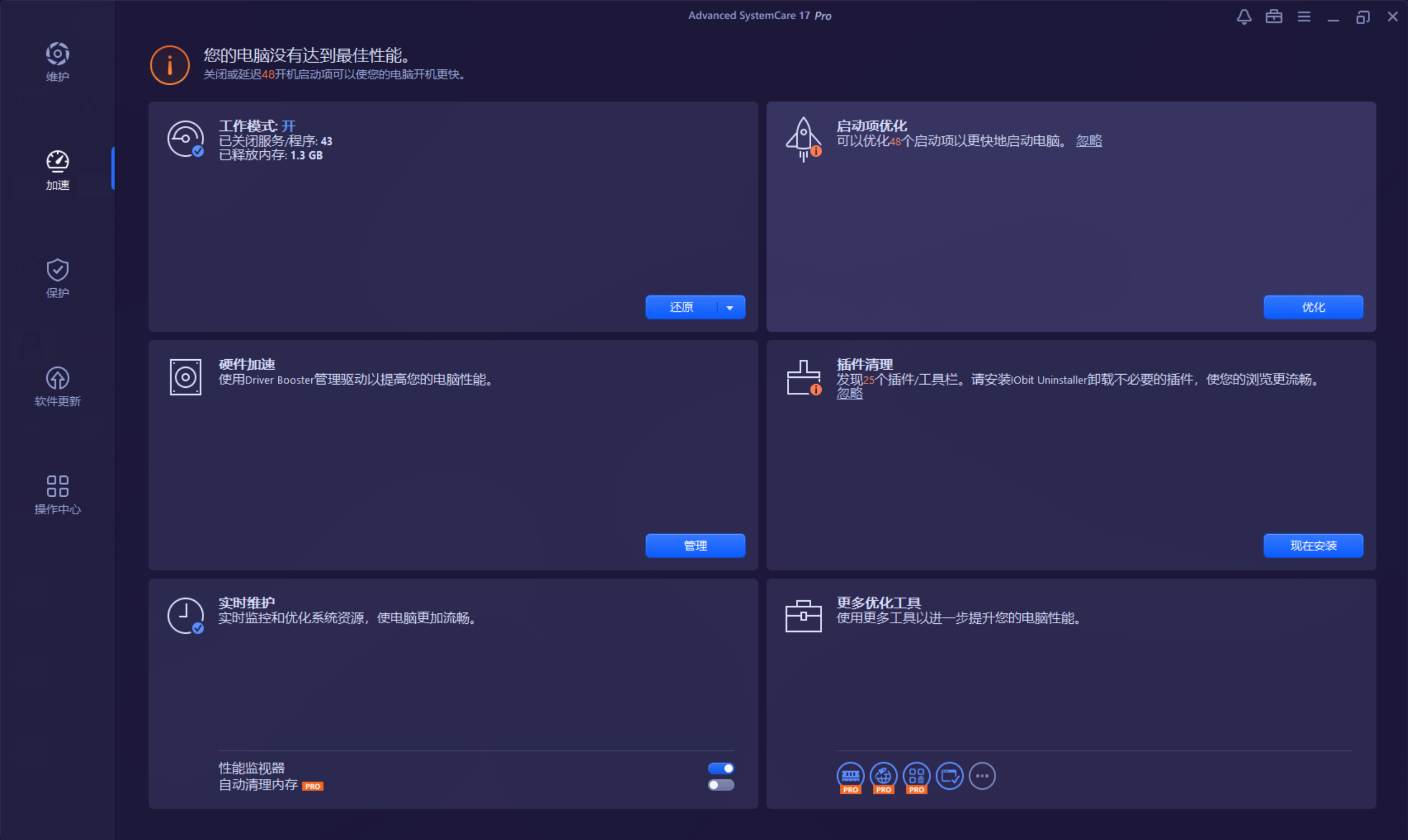 IObit Advanced SystemCare具有新的性能监视器,可以通过一次单击释放内存,以便在几秒钟内平滑PC运行。