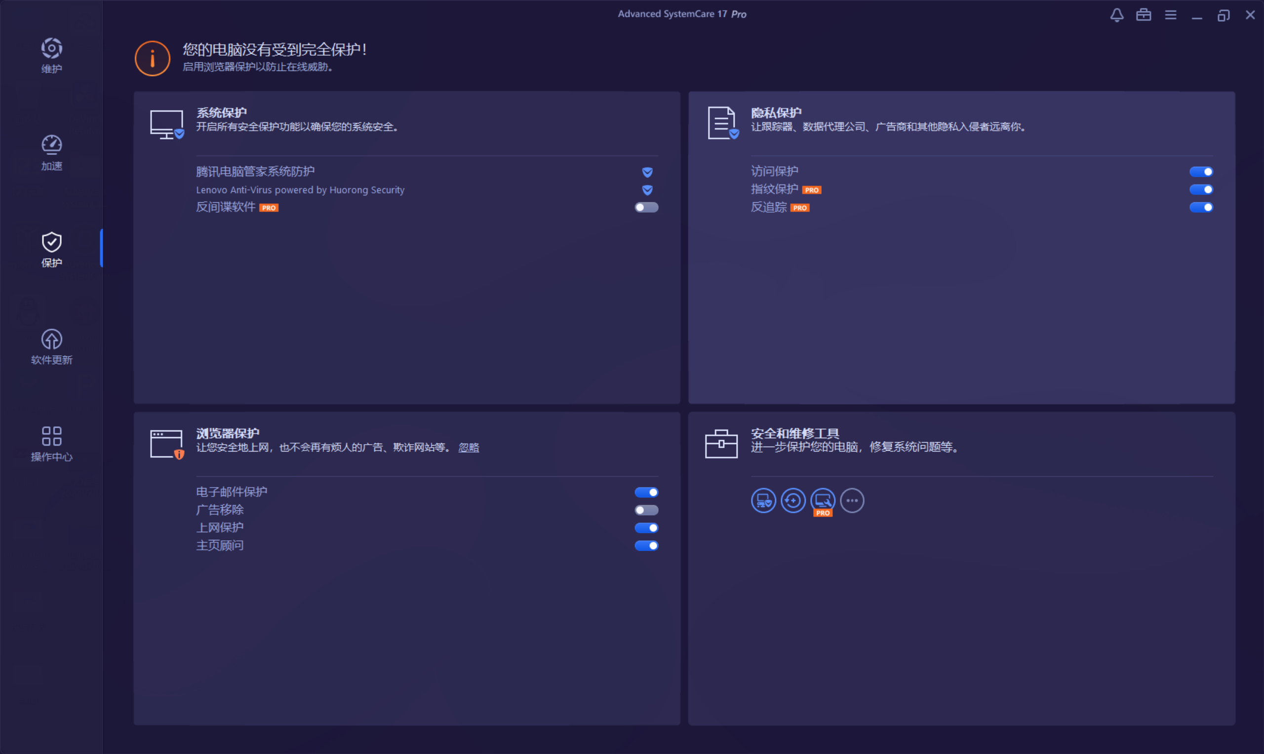 答:是的,所有版本的Advanced SystemCare都与大多数主要安全产品兼容,例如防病毒,反间谍软件和防火墙解决方案。除了软件中的系统性能调整工具外,建议您使用高质量的安全程序来确保计算机的安全。我们的Advanced SystemCare Ultimate将是您完美的解决方案。它提供非常好的防病毒功能和已经过验证的全面PC调整功能。