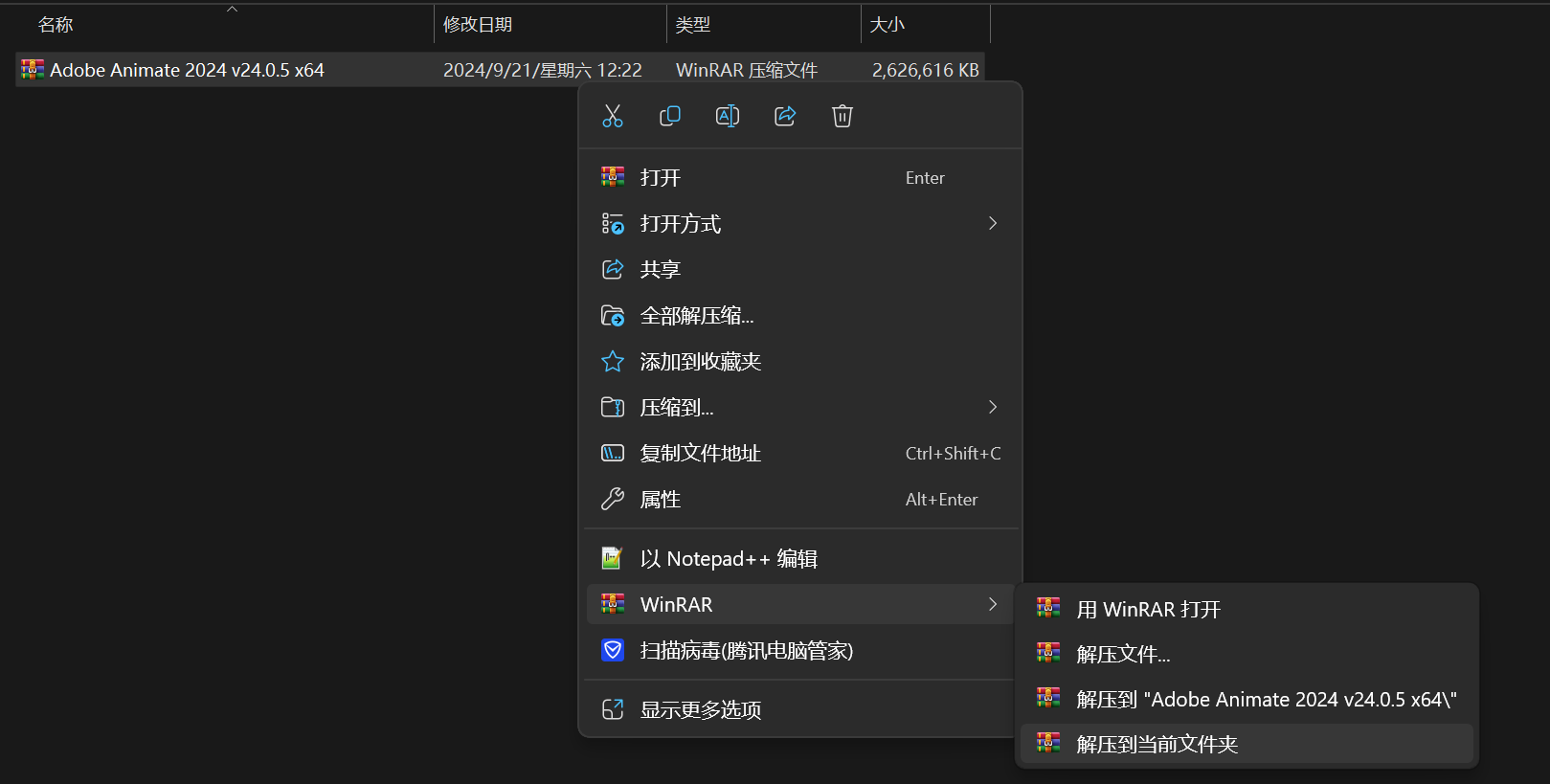 1、右键解压到当前文件夹(如果下载完成,不是压缩图标显示,显示白色或者浏览器图样,说明你电脑没有解压软件,自行安装解压软件)