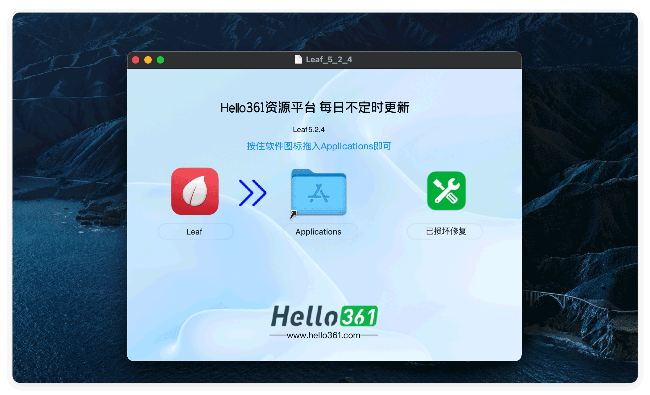 安装包下载完成后,将左侧程序拖动到右侧文件夹即可