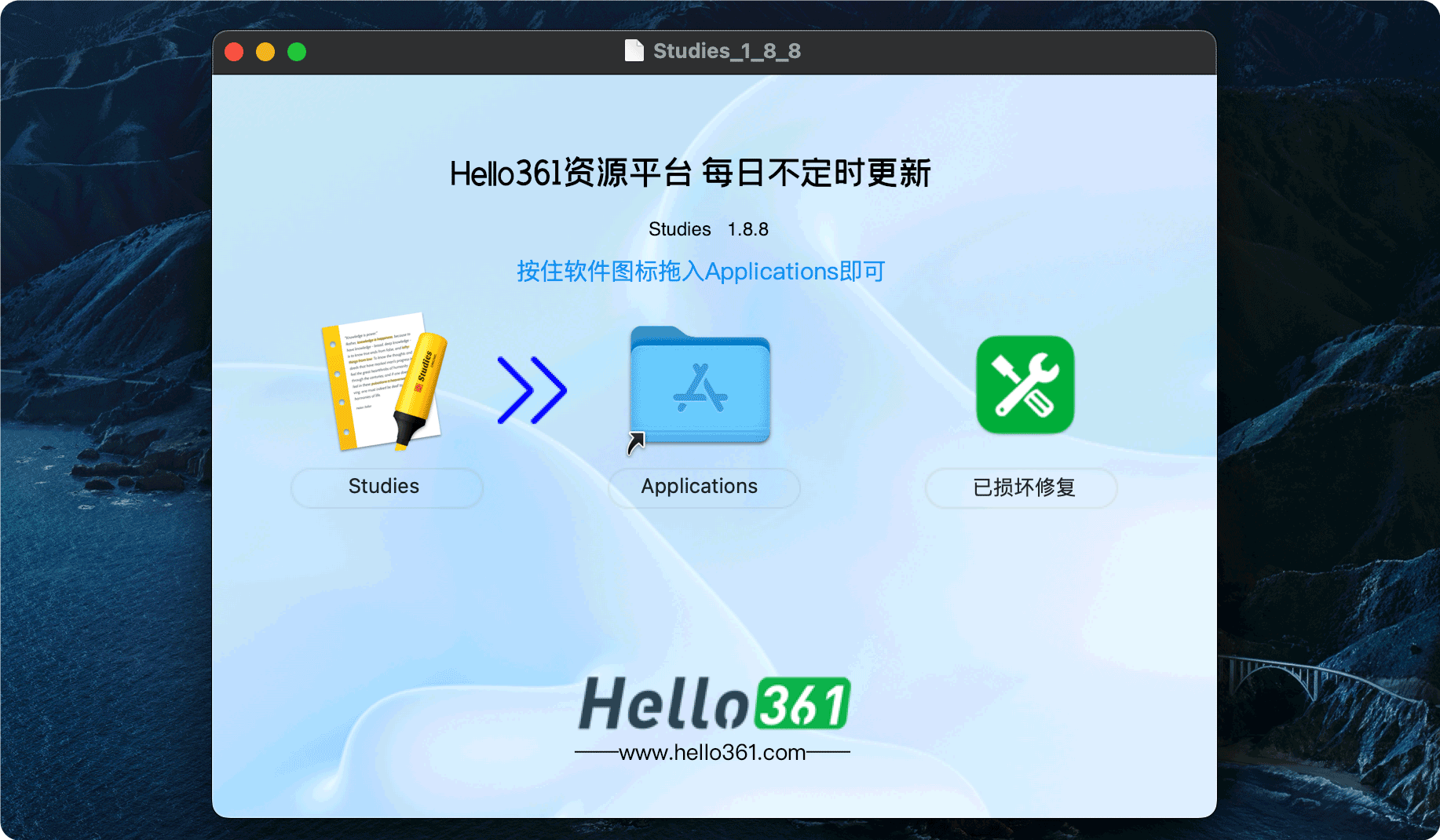 软件下载完成后,拖动左侧的Studies到右侧应用程序中即可。