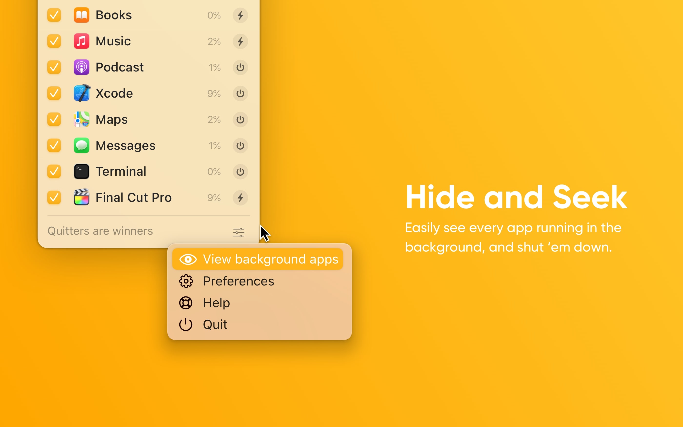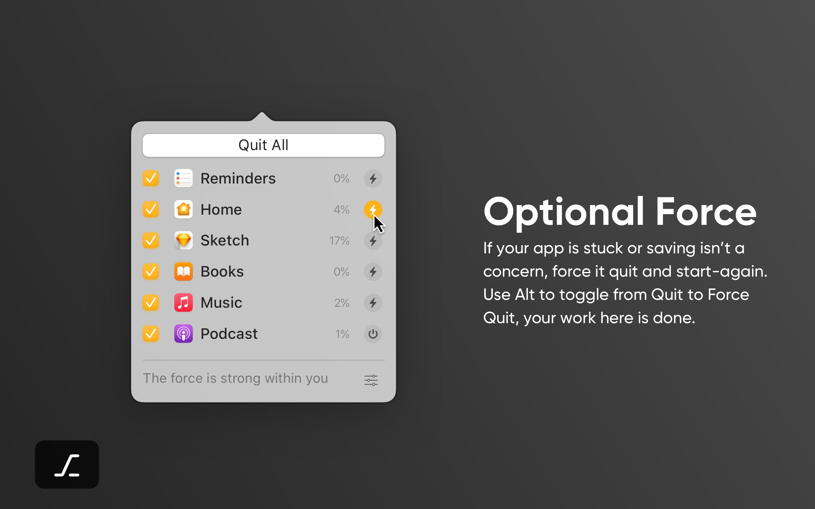您是否喜欢同时处理多项任务,但不喜欢一次关闭多个应用程序?或者工作是否会因为后台运行的应用程序过载而停止工作?在重新启动之前,尝试使用菜单栏中名为 Quit All 的便捷助手退出所有或多个选定的应用程序!