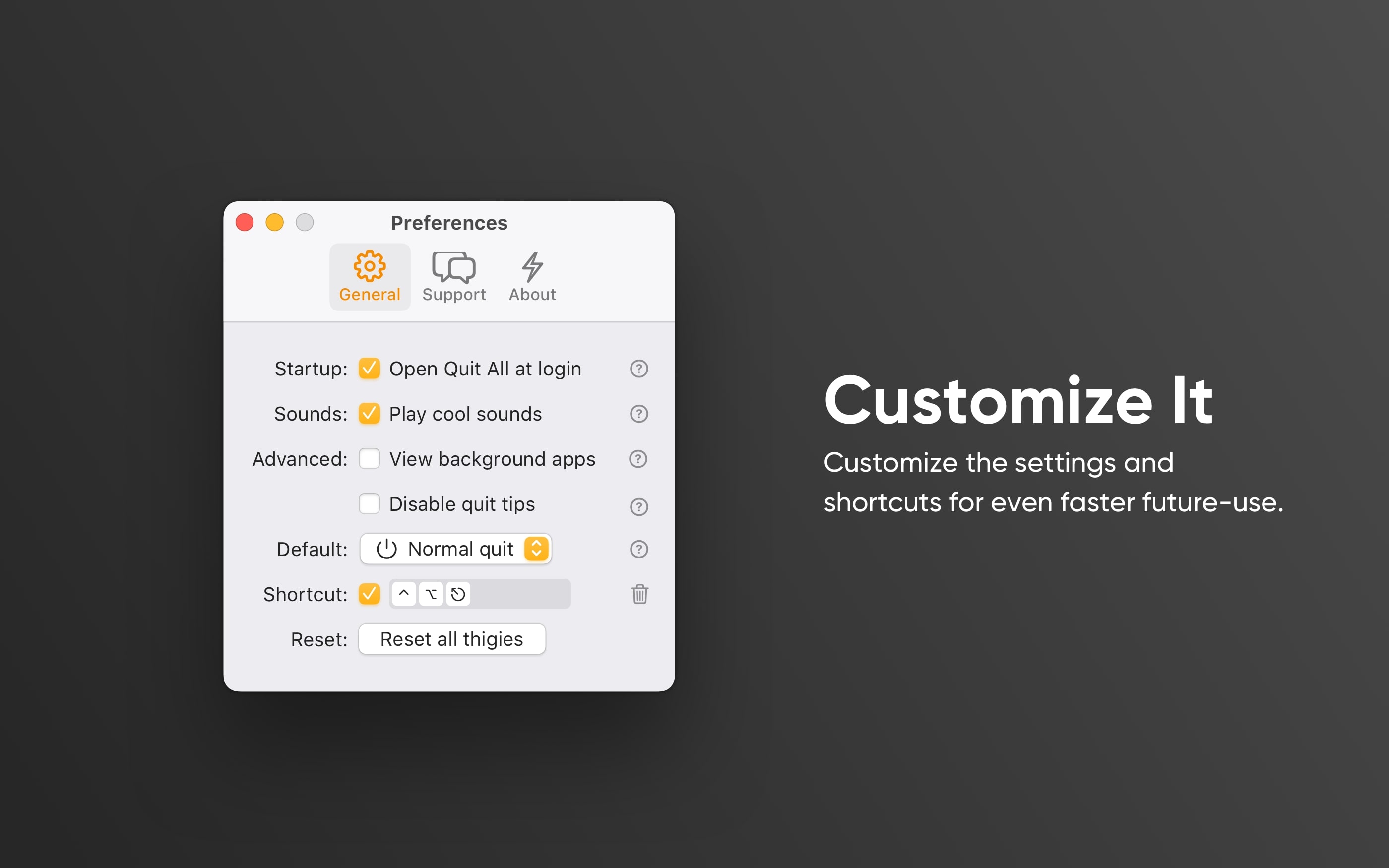 当您希望菜单栏助手与您的桌面融为一体时,Quit All 有一个暗模式。您还可以根据自己的喜好调整众多应用程序设置,即:登录时启动、键盘快捷键、默认退出、音效等等。