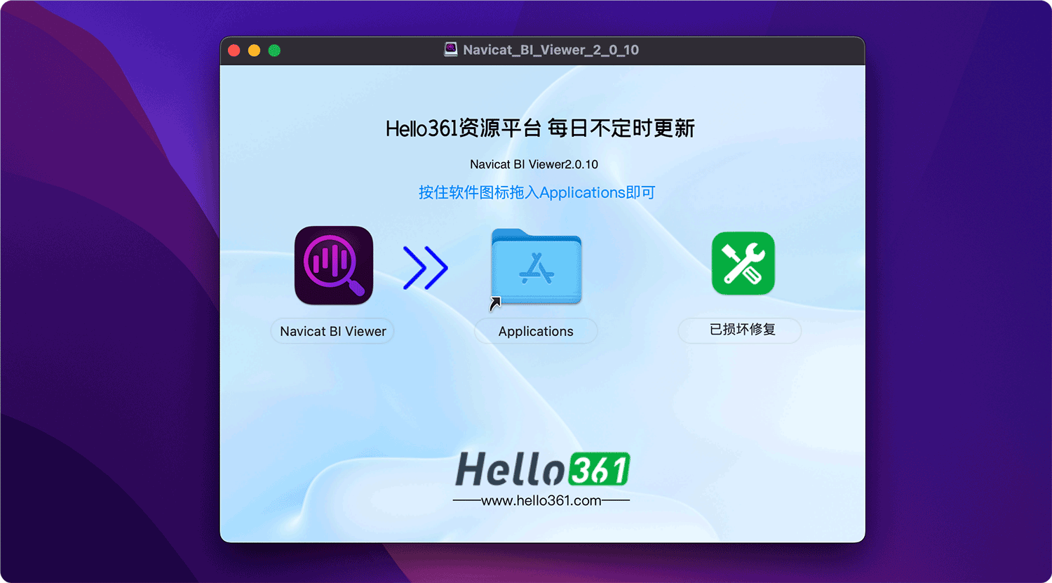 安装包下载完成后,将左侧程序拖动到右侧文件夹即可