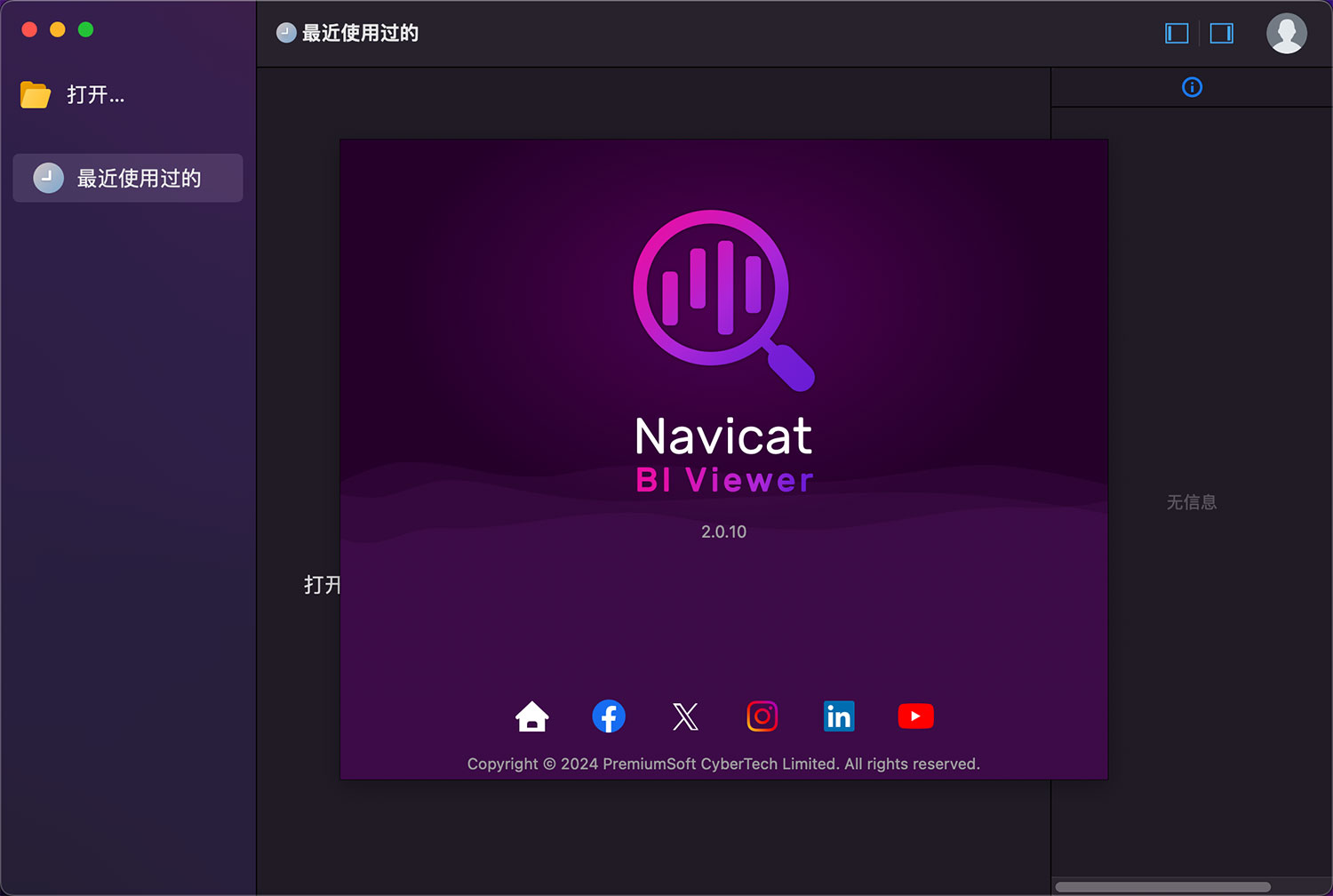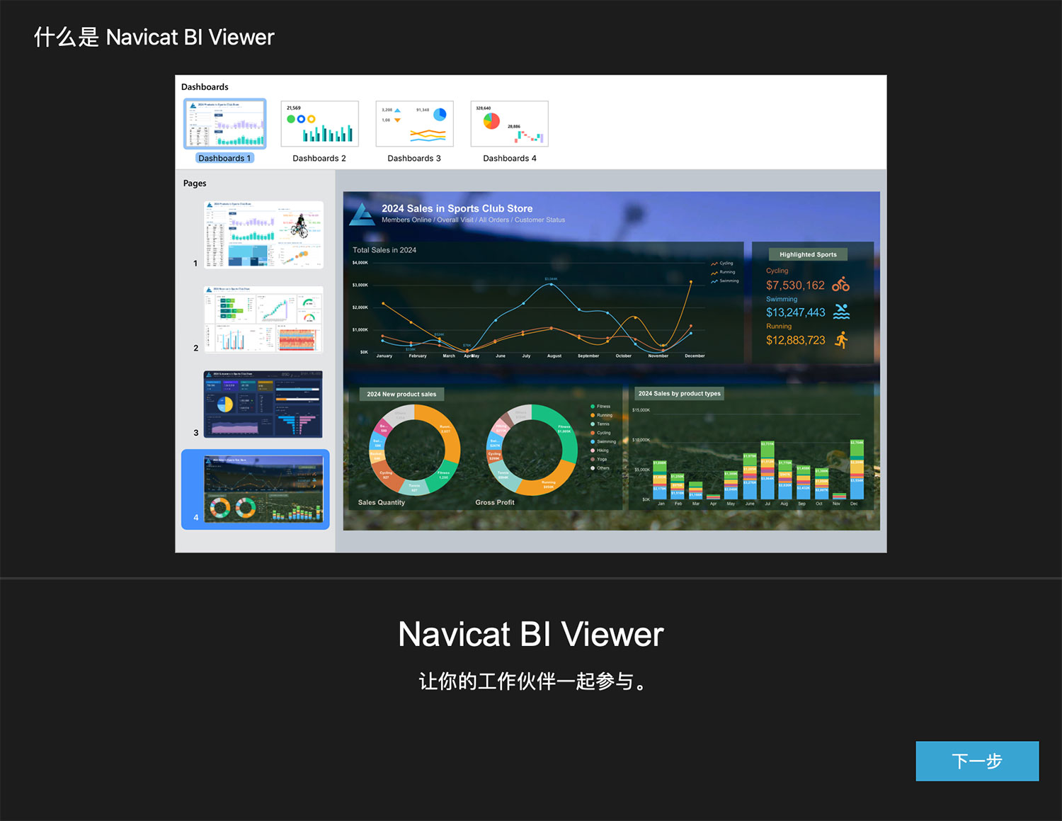 Navicat BI Viewer 是一个易于使用的工具,用于查看 BI 工作区文件。让你可以浏览由 Navicat 的 BI 功能或 Navicat BI 设计的工作区。