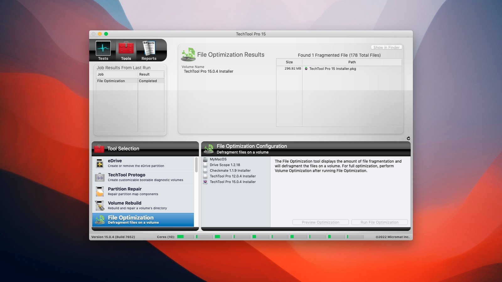• TechTool Pro可执行文件和卷优化。文件优化对硬盘驱动器上的单个文件进行碎片整理。卷优化可整合硬盘上的可用空间。要进行完全优化,请在文件优化后执行音量优化。由此产生的优化简化了文件存储布局,并可能提高驱动器的整体性能。