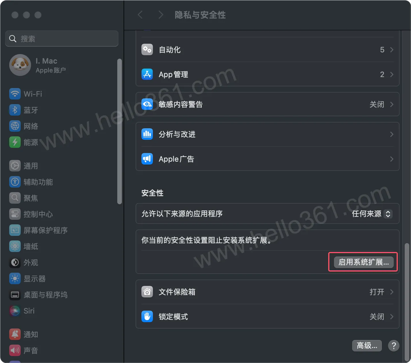 但是此类软件安装上之后如果不打开电脑默认系统扩展却使用不了,那我们如果打开MAC OS系统M1-M4芯片的系统扩展呢?
