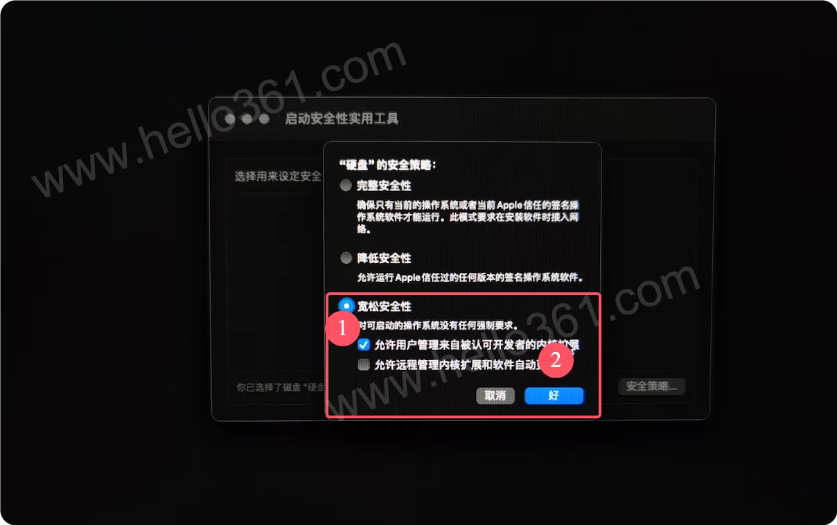 - 勾选”降低安全性”和”允许用户管理来自被认可开发者的内核扩展”,然后点击右下角的”好”来确认。