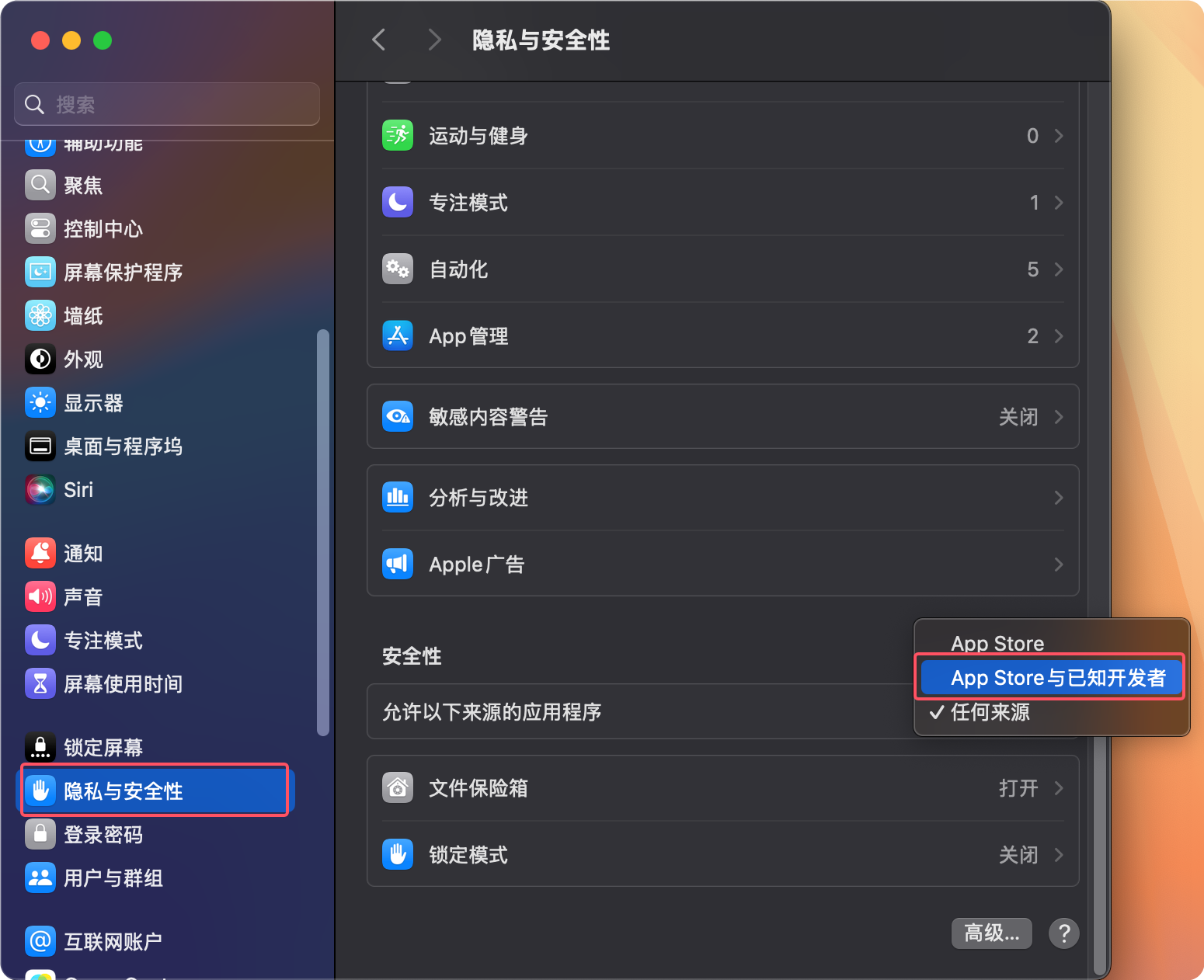 2.2 打开系统设置,转到“隐私和安全”部分,找到下面的“安全”小节,将值“允许使用应用程序”更改为“任何来源”。
