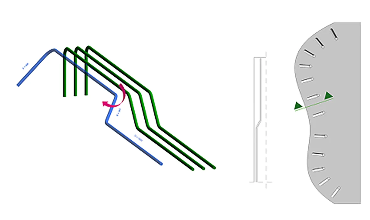 曲柄和弯钩旋转:曲柄旋转将应用于集中的所有钢筋,并定义钢筋形状。使用“编辑钢筋”旋转各个钢筋。对于自由形式钢筋,曲柄的默认旋转(0 度)垂直于主体表面。