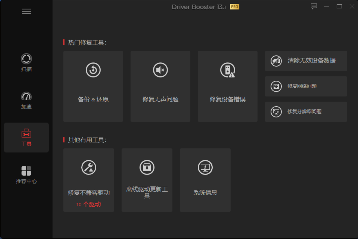 您是否遇到过某些驱动程序错误导致的系统崩溃或蓝屏死机问题?驱动程序Booster 7提供了一些有用的工具,可以有效地修复常见的Windows问题。它可以解决由于驱动程序更新失败而导致的某些蓝屏死机问题。此外,它支持修复大多数无声音问题和网络故障,以获得更好的用户体验。