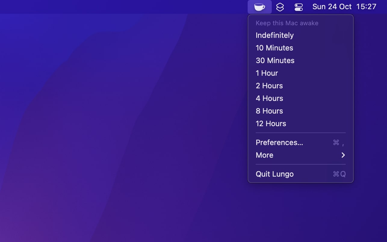 Lungo 允许您根据自己的喜好自定义计算机的“无睡眠”模式。根据任务的不同,可能需要几分钟或一整天。下拉菜单提供从 10 分钟到“无限”的选项。