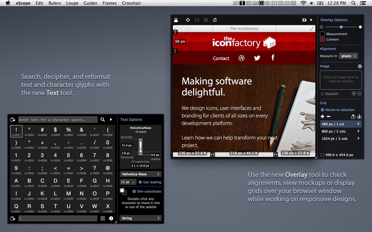 xScope – 专为设计人员和开发人员创建。该应用程序是一组功能强大的十个可配置工具,非常适合测量、检查和测试屏幕上的图形和各种布局。