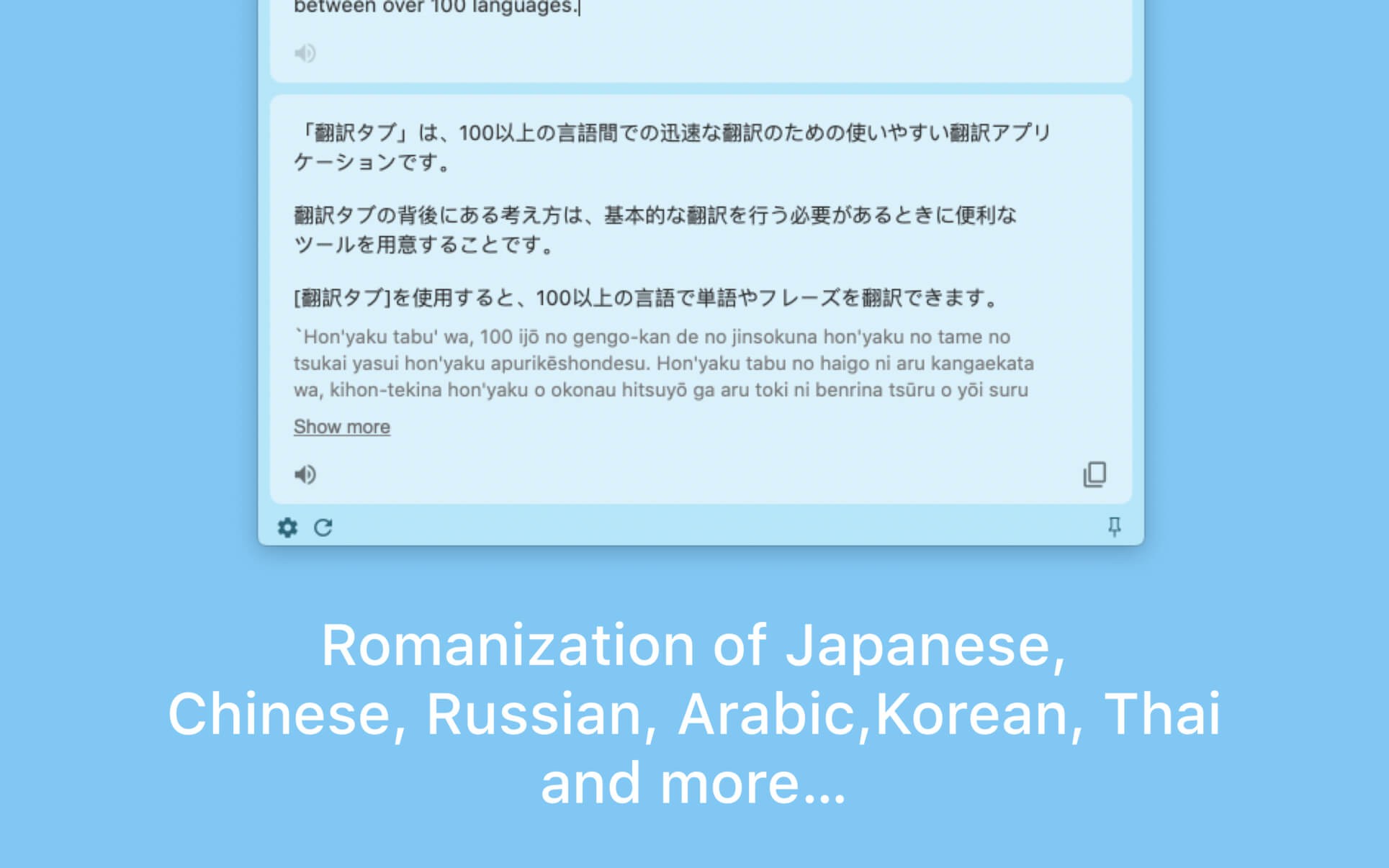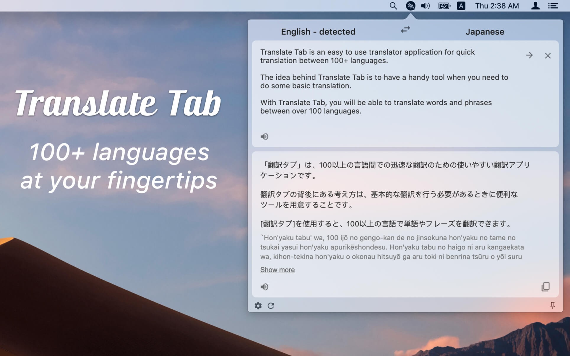 Translate Tab for Mac翻译标签是一个易于使用的快速翻译工具。翻译选项卡背后的想法是在您需要进行一些基本翻译时手头有一个工具。使用翻译选项卡,您可以翻译 100 多种语言的单词和短语。