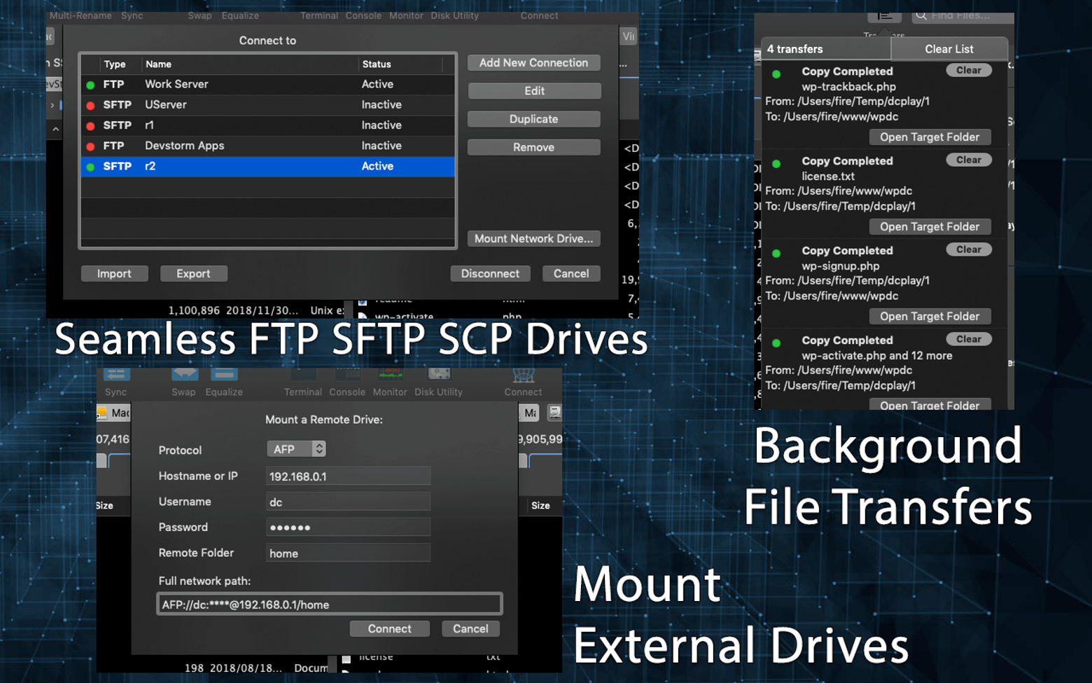 内置管理器允许您在瞬间添加外部服务器和其他存储路径。您不仅可以连接到 FTP 和 SCP 驱动器,还可以在它们上预览和打开外部文件。如有必要,DCommander 将为您提供另一个完全控制选项。