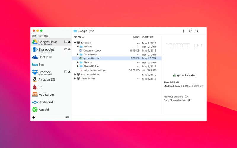 该程序允许您将远程信息存储(FTP、WebDAV、Dropbox、Google Drive、Amazon S3 等)安装为熟悉的驱动器,该驱动器将与其他驱动器一起出现在 Finder 中。