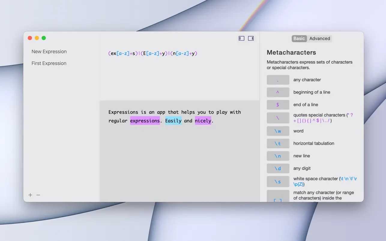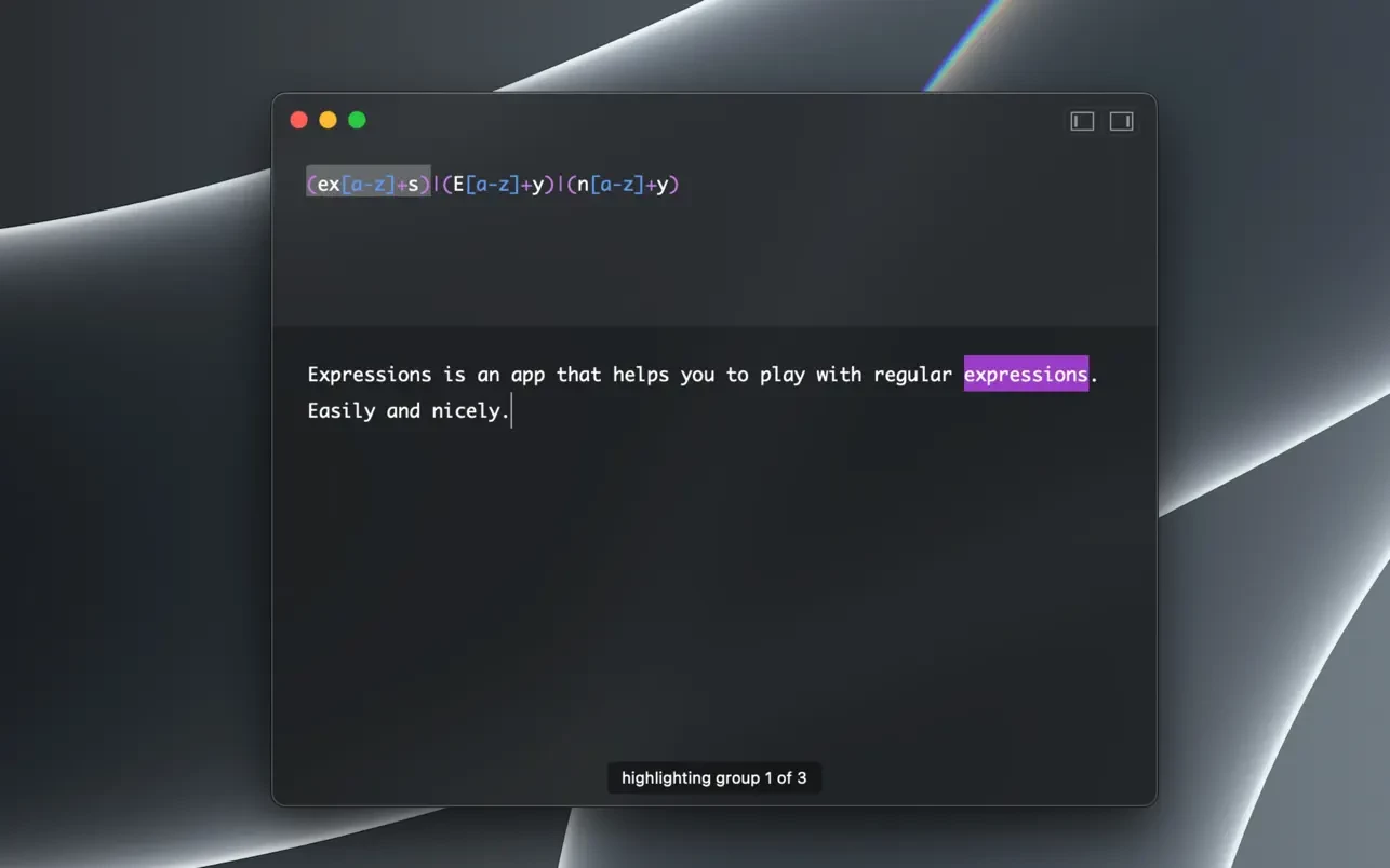 Expressions for Mac允许使用正则表达式。只需键入您的模式和一些文本即可对其进行测试。在您输入文字或图案时,所有更改都会更新。应用程序突出显示语法,因此该模式易于阅读和修改。如果使用子表达式(组),则可以通过按cmd + shift +](或[-减少突出显示的组号)来突出显示它们。