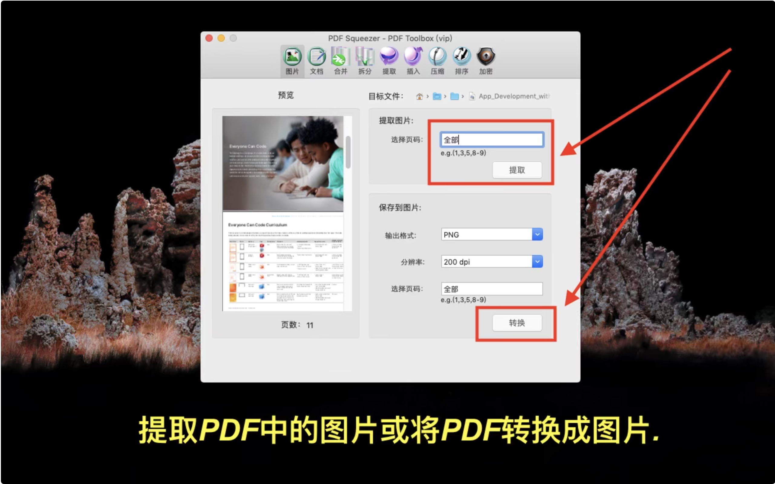 您可以指定PDF文件的页码,然后提取里面的图片或将整个页面转换为指定格式的任何其他图像文件(png,jpeg,bmp,tiff,gif);
