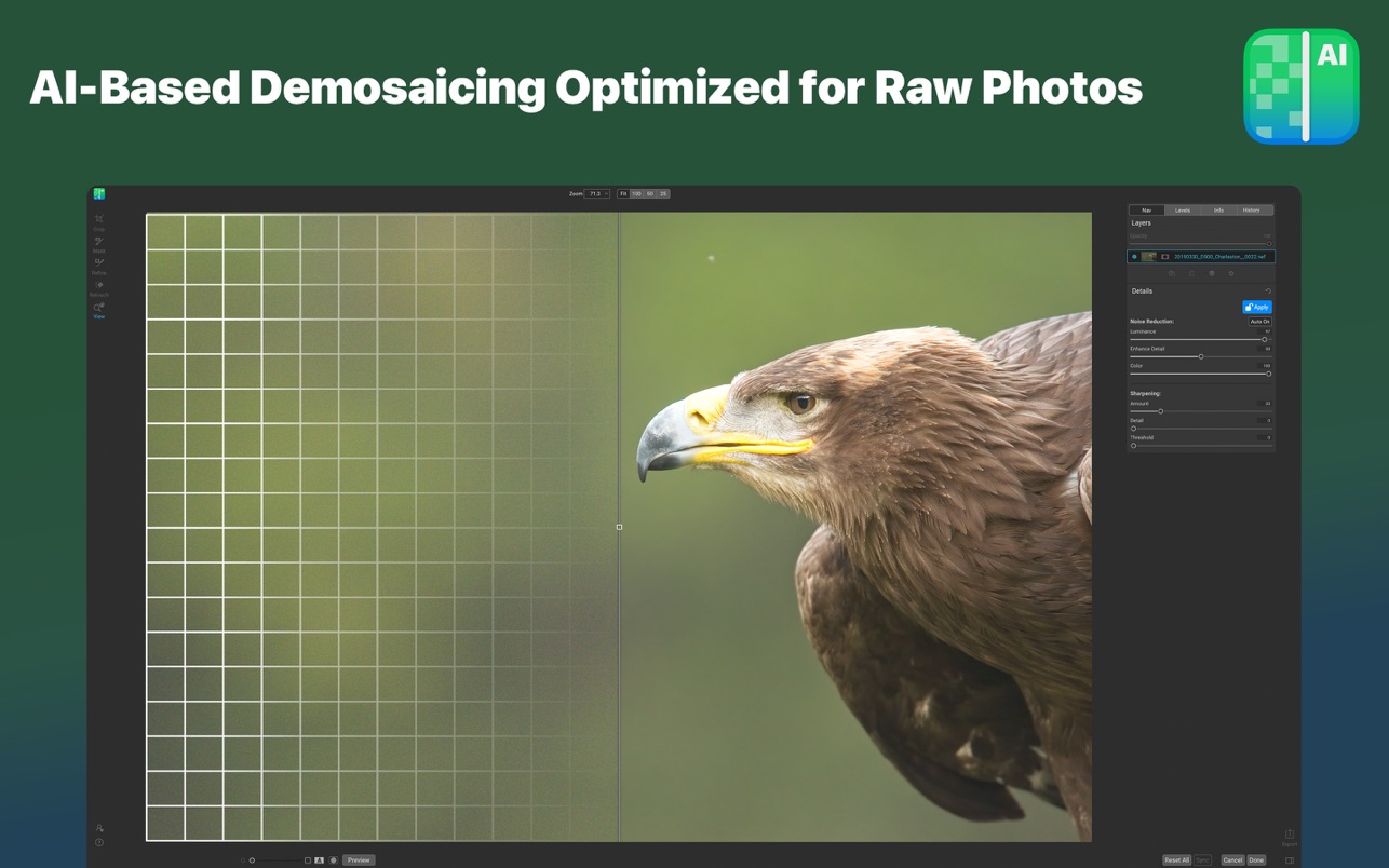 使用先进的机器学习技术创建 AI 网络,以消除亮度和色度噪声,同时保留细节,这是其他应用程序无法提供的卓越结果。