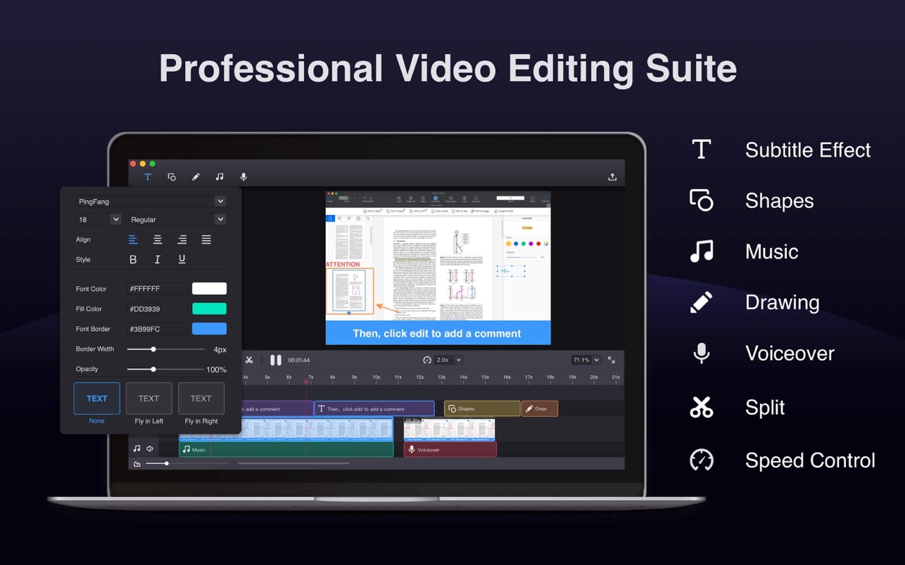 – 使用基本的编辑工具编辑视频:文本,形状,手绘笔,iTunes音乐,剪辑,拆分,删除,重做,撤消
